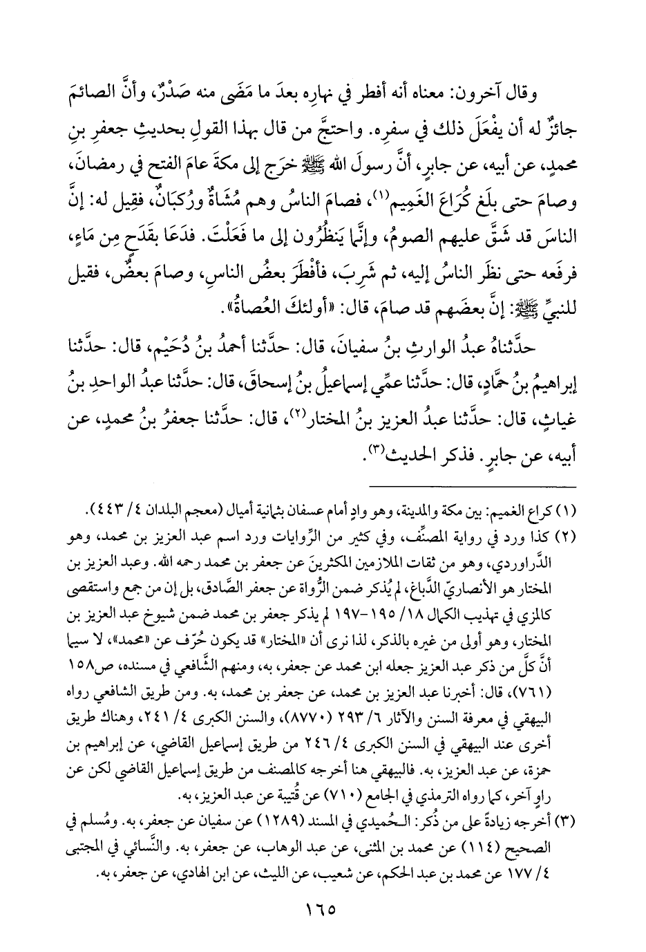 وقال آخرون: معناه أنه أفطر في نهارِه بعدَ ما مَضَى منه صَدْرٌ، وأنَّ الصائمَ جائزٌ له أن يفْعَلَ ذلك في سفرِه. واحتجَّ من قال بهذا القولِ بحديثِ جعفرِ بنِ محمدٍ، عن أبيه، عن جابرٍ، أنَّ رسولَ الله - صلى الله عليه وسلم - خرَج إلى مكةَ عامَ الفتح في رمضانَ، وصامَ حتى بلَغ كُرَاعَ الغَمِيم (¬١)، فصامَ الناسُ وهم مُشَاةٌ ورُكبَانٌ، فقِيل له: إنَّ الناسَ قد شَقَّ عليهم الصومُ، وإنَّما يَنظُرُون إلى ما فَعَلْتَ. فدَعَا بقَدَحٍ مِن مَاءٍ، فرفَعه حتى نظَر الناسُ إليه، ثم شَرِبَ، فأفْطَرَ بعضُ الناسِ، وصامَ بعضٌ، فقيل للنبيِّ - صلى الله عليه وسلم -: إنَّ بعضَهم قد صامَ، قال: "أولئكَ العُصاةُ".