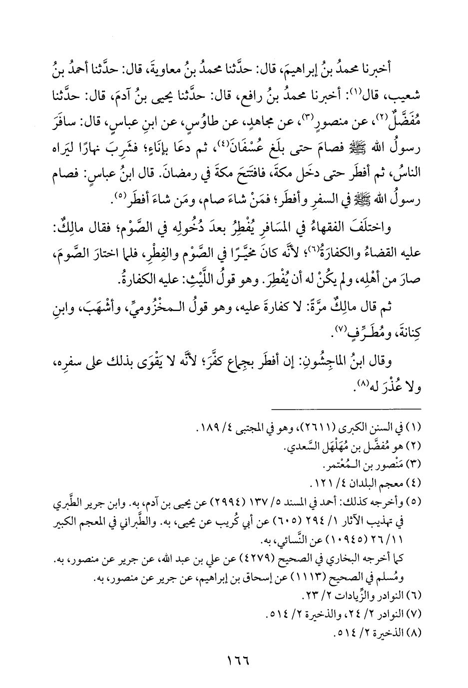 أخبرنا محمدُ بنُ إبراهيمَ، قال: حدَّثنا محمدُ بنُ معاويةَ، قال: حدَّثنا أحمدُ بنُ شعيب، قال (¬١): أخبرنا محمدُ بنُ رافع، قال: حدَّثنا يحيى بنُ آدمَ، قال: حدَّثنا مُفَضَّلٌ (¬٢)، عن منصورٍ (¬٣)، عن مجاهدٍ، عن طاوُسٍ، عن ابنِ عباسٍ، قال: سافَرَ رسولُ الله - صلى الله عليه وسلم - فصامَ حتى بلَغ عُسْفَانَ (¬٤)، ثم دعَا بإنَاءٍ؛ فشَرِبَ نهارًا ليَراه الناسُ، ثم أفطَر حتى دخَل مكةَ، فافتَتحَ مكةَ في رمضانَ. قال ابنُ عباسٍ: فصام رسولُ الله - صلى الله عليه وسلم - في السفرِ وأفطَر؛ فمَنْ شاءَ صام، ومَن شاءَ أفطَر (¬٥).