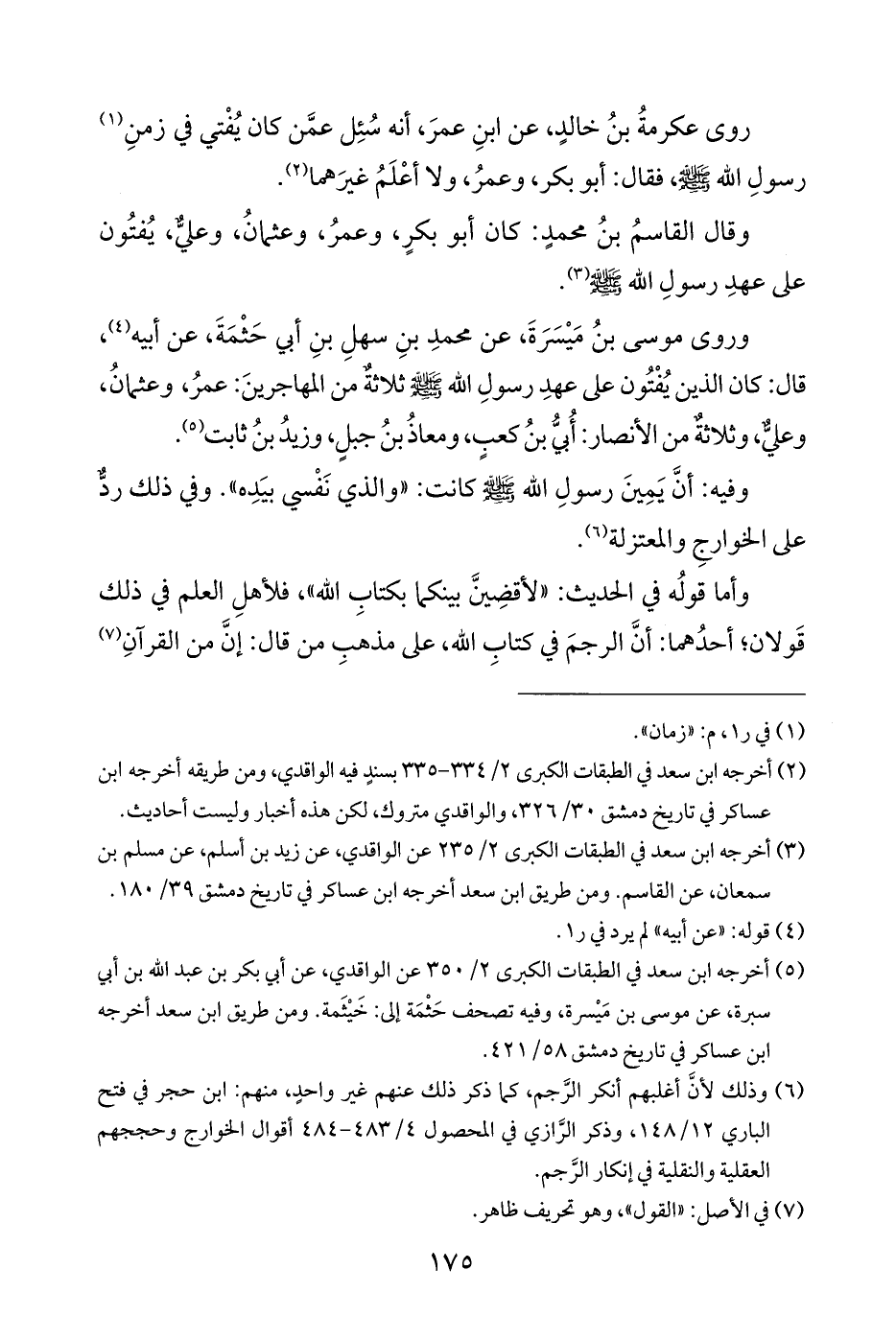 (¬٦) وذلك لأنَّ أغلبهم أنكر الرَّجم، كما ذكر ذلك عنهم غير واحدٍ، منهم: ابن حجر في فتح الباري ١٢/ ١٤٨، وذكر الرَّازي في المحصول ٤/ ٤٨٣ - ٤٨٤ أقوال الخوارج وحججهم العقلية والنقلية في إنكار الرَّجم.