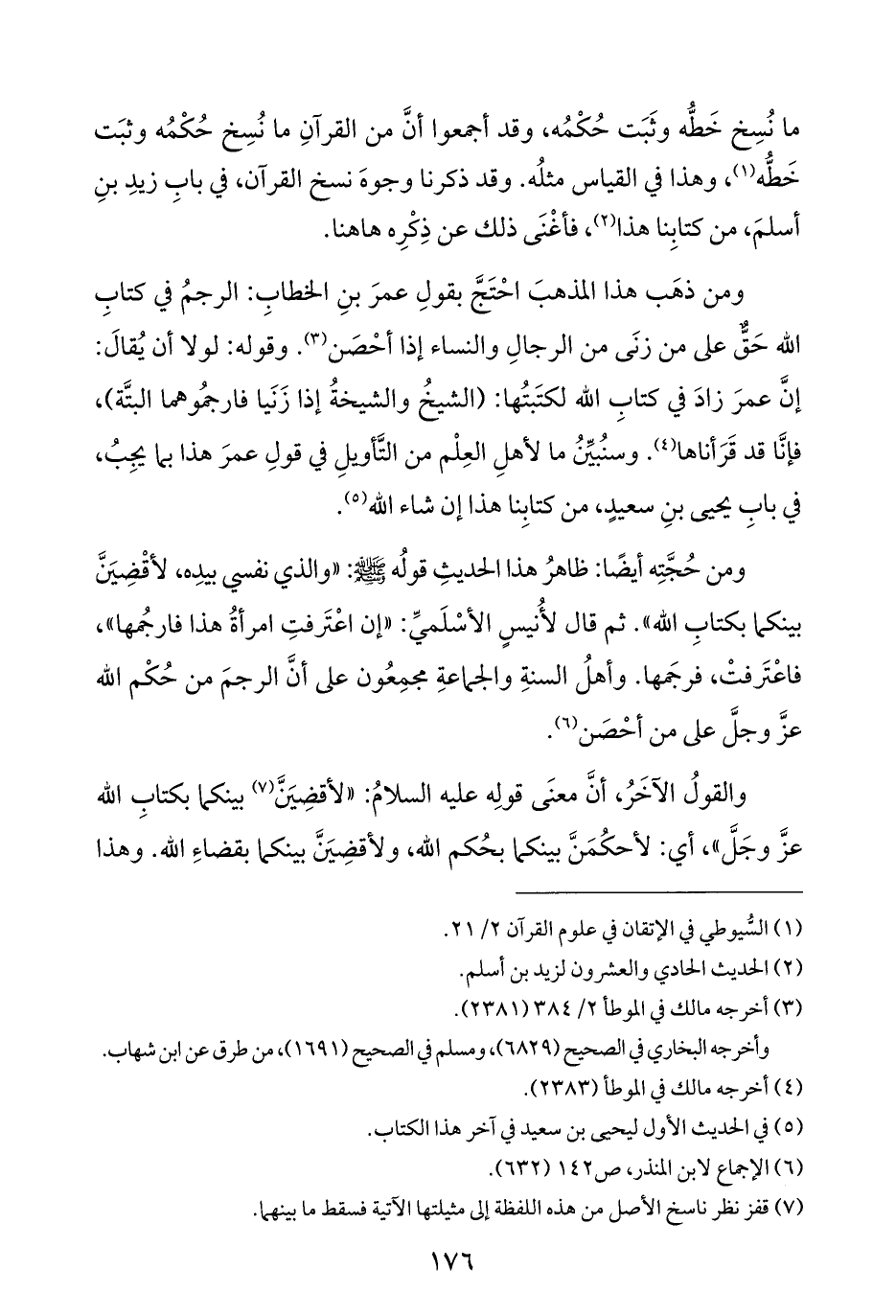 ما نُسِخ خَطُّه وثَبَت حُكْمُه، وقد أجمعوا أنَّ من القرآنِ ما نُسِخ حُكْمُه وثبَت خَطُّه (¬١)، وهذا في القياس مثلُه. وقد ذكرنا وجوهَ نسخ القرآن، في بابِ زيدِ بنِ أسلمَ، من كتابِنا هذا (¬٢)، فأغْنَى ذلك عن ذِكْرِه هاهنا.