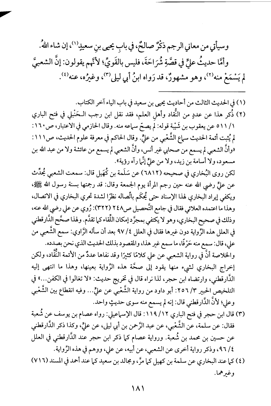 (¬٢) ذُكر هذا عن عددٍ من النُّقاد وأهلِ العلم، فقد نقل ابن رجب الحَنْبلي في فتح الباري ١/ ٥١١ عن يعقوب بن شَيْبة قوله: لم يصحّ سماعه منه. وقال الحازمي في الاعتبار، ص ١٦٠: لم يُثبت أئمة الحديث سماع الشَّعْبي من عليٍّ. وقال الحاكم في معرفة علوم الحديث، ص ١١١: "وأنَّ الشعبي لم يسمع من صحابي غير أنس، وأنَّ الشعبي لم يسمع من عائشة ولا من عبد الله بن مسعود، ولا أسامة بن زيد، ولا من عليٍّ إنَّما رآه رؤية".