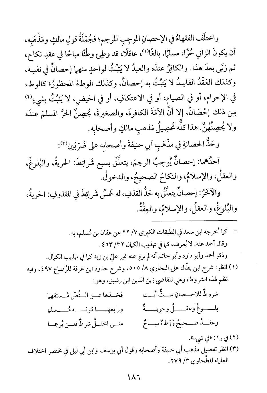 أحدُهما: إحصانٌ يُوجِبُ الرجمَ، يتعلَّقُ بسبع شَرائِطَ: الحريةُ، والبُلوغُ، والعقلُ، والإسلامُ، والنكاحُ الصحيحُ، والدخولُ.