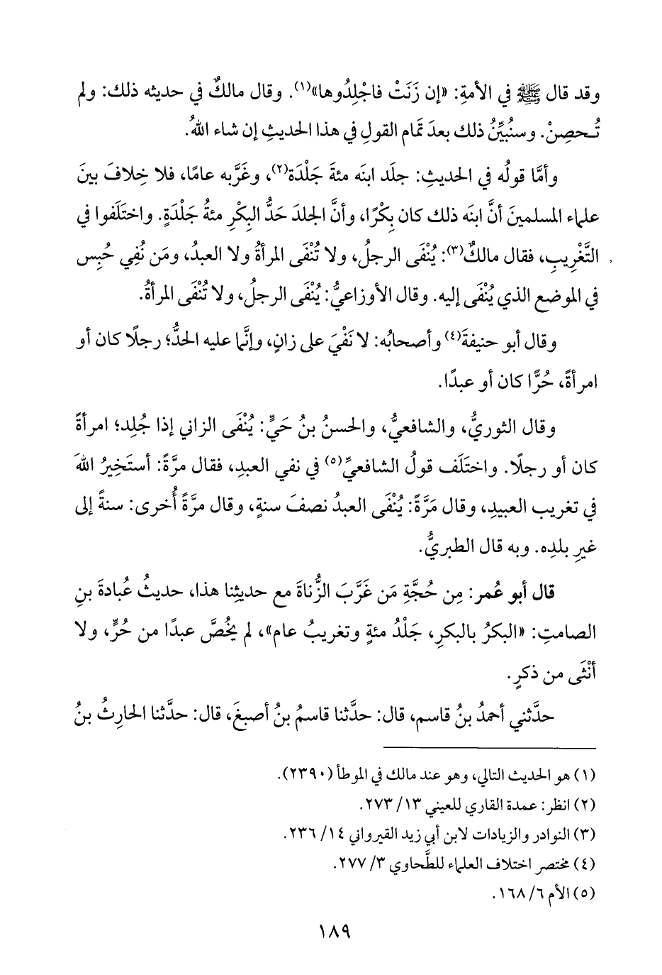 قال أبو عُمر: مِن حُجَّةِ مَن غَرَّبَ الزُّناةَ مع حديثنا هذا، حديثُ عُبادةَ بنِ الصامتِ: "البكرُ بالبكرِ، جَلْدُ مئةٍ وتغريبُ عام"، لم يخُصَّ عبدًا من حُرِّ، ولا أنْثَى من ذكرٍ.