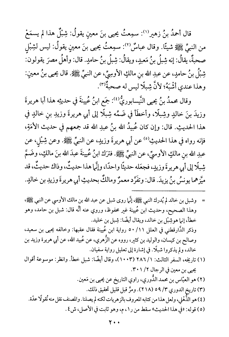قال أحمدُ بنُ زهير (¬١): سمِعتُ يحيى بنَ معينٍ يقولُ: شِبْلٌ هذا لم يسمَعْ من النبيِّ - صلى الله عليه وسلم - شيئًا. وقال عباسٌ (¬٢): سمِعتُ يحيى بنَ معينٍ يقولُ: ليس لشِبْلٍ صحبةٌ، يقالُ: إنه شِبلُ بنُ مَعبدٍ، ويقالُ: شِبلُ بنُ حامدٍ. قال: وأهلُ مصرَ يقولون: شِبْلُ بنُ حامدٍ، عن عبدِ الله بنِ مالكٍ الأوسيِّ، عن النبيِّ - صلى الله عليه وسلم -. قال يحيى بنُ معينٍ: وهذا عندي أشْبَهُ؛ لأنَّ شِبلًا ليس له صحبةٌ (¬٣).