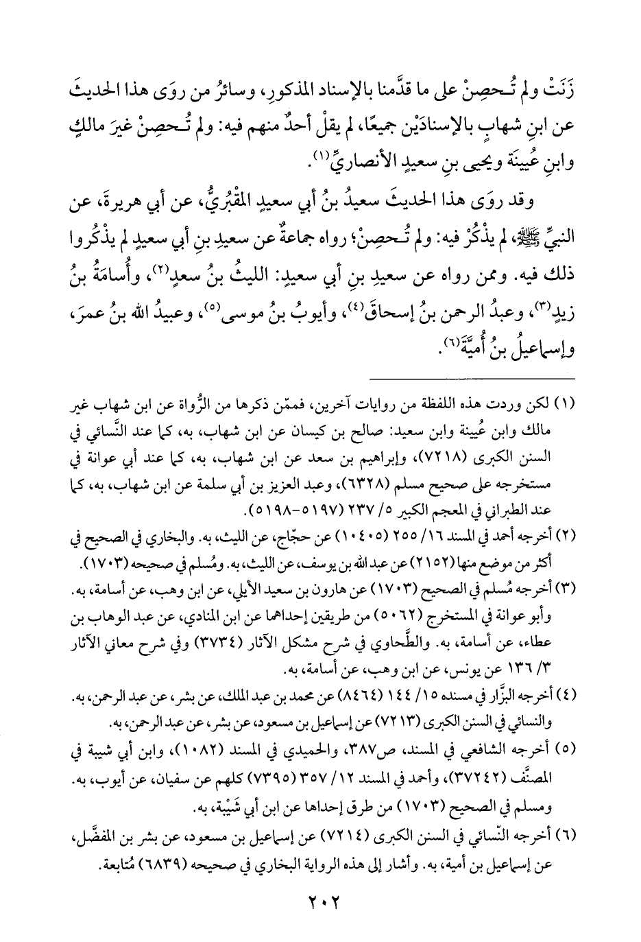 (¬١) لكن وردت هذه اللفظة من روايات آخرين، فممّن ذكرها من الرُّواة عن ابن شهاب غير مالك وابن عُيينة وابن سعيد: صالح بن كيسان عن ابن شهاب، به، كما عند النَّسائي في السنن الكبرى (٧٢١٨)، وإبراهيم بن سعد عن ابن شهاب، به، كما عند أبي عوانة في مستخرجه على صحيح مسلم (٦٣٢٨)، وعبد العزيز بن أبي سلمة عن ابن شهاب، به، كما عند الطبراني في المعجم الكبير ٥/ ٢٣٧ (٥١٩٧ - ٥١٩٨).