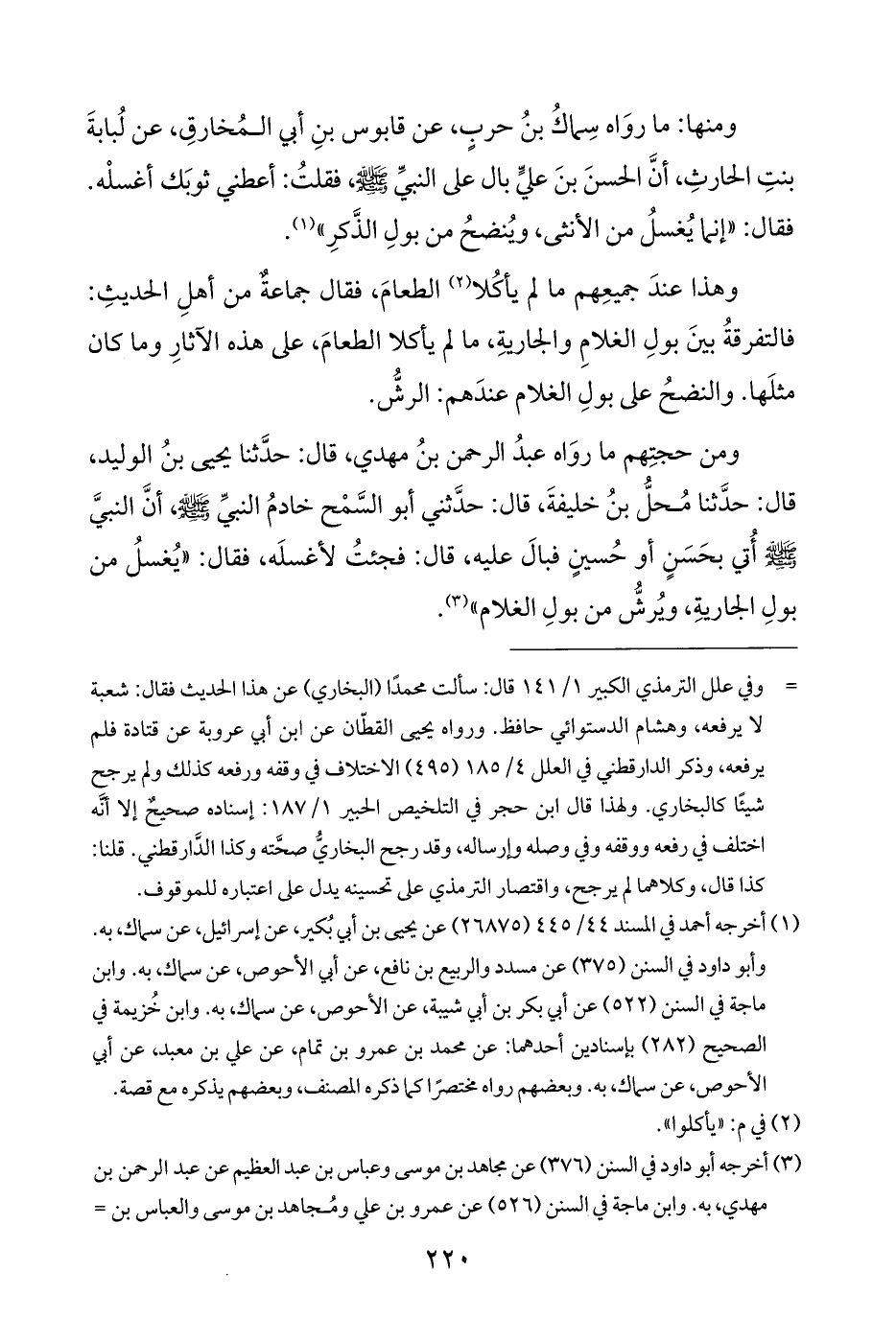 ومنها: ما روَاه سِماكُ بنُ حربٍ، عن قابوس بنِ أبي المُخارقِ، عن لُبابةَ بنتِ الحارثِ، أنَّ الحسنَ بنَ عليِّ بال على النبيِّ - صلى الله عليه وسلم -، فقلتُ: أعطني ثوبَك أغسلْه. فقال: "إنما يُغسلُ من الأنثى، ويُنضحُ من بولِ الذَّكرِ" (¬١).