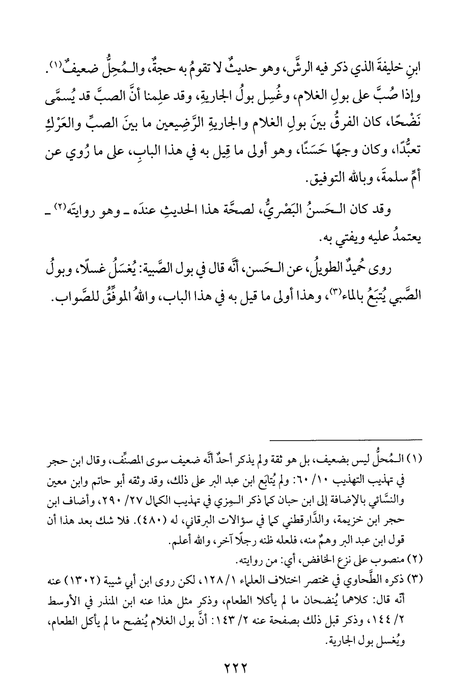 روى حُميدٌ الطويلُ، عن الحَسن، أنَّه قال في بول الصَّبية: يُغسَلُ غسلًا، وبولُ الصَّبي يُتبَعُ بالماء (¬٣)، وهذا أولى ما قيل به في هذا الباب، واللّهُ الموفِّقُ للصَّواب.