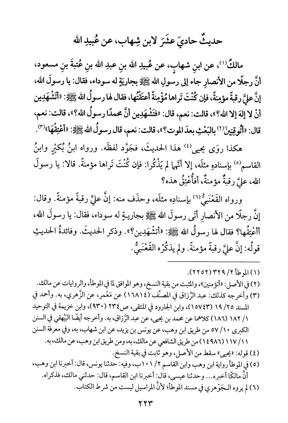 مالكٌ (¬١)، عن ابنِ شهاب، عن عُبيدِ الله بنِ عبدِ الله بنِ عُتبةَ بنِ مسعود، أنَّ رجلًا من الأنصارِ جاء إلى رسولِ الله - صَلَّى اللهُ عَلَيْهِ وَسَلَّمَ - بجاريَةٍ له سوداء، فقال: يا رسولَ الله، إنَّ عليَّ رقبةً مؤمِنةً، فإن كُنْتَ تَراها مُؤْمنةً أعتَقْتُها، فقال لها رسولُ الله - صَلَّى اللهُ عَلَيْهِ وَسَلَّمَ -: "أَتَشْهَدِين أنْ لا إلهَ إلَّا الله؟ "، قالت: نعم، قال: "فتَشْهَدِين أنَّ محمدًا رسولُ الله؟ "، قالت: نعم، قال: "أتُوقِنِينَ (¬٢) بالبَعْثِ بعدَ الموت؟ "، قالت: نعم، قال رسولُ الله - صَلَّى اللهُ عَلَيْهِ وَسَلَّمَ -: "أعْتِقْهَا" (¬٣).