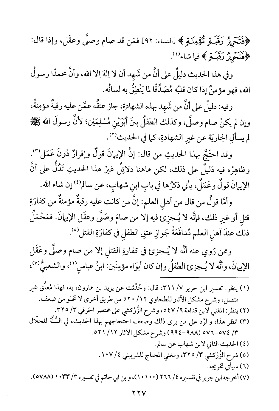 وأمَّا قولُ من قال من أهلِ العلم: إنَّ من كانت عليه رقبةٌ مؤمنةٌ من كفارَةِ قتلٍ أو غيرِ ذلك، فإنَّه لا يُجزِئ فيه إلَّا من صامَ وصَلَّى وعقَل الإيمانَ. فمَحْمَلُ ذلك عندَ أهلِ العلم مُدافَعَةُ جَوازِ عتقِ الطفلِ في كفارَةِ القتل (¬٥).