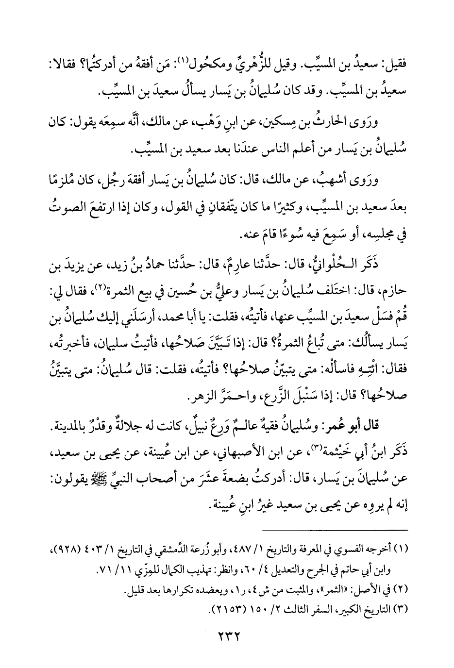 قال أبو عُمر: وسُليمانُ فقيهٌ عالمٌ وَرعٌ نبيلٌ، كانت له جلالةٌ وقدْرٌ بالمدينة. ذَكَر ابنُ أبي خَيْثمة (¬٣)، عن ابن الأصبهاني، عن ابن عُيينة، عن يحيى بن سعيد، عن سُليمانَ بن يَسار، قال: أدركتُ بضعةَ عشَرَ من أصحاب النبيِّ - صَلَّى اللهُ عَلَيْهِ وَسَلَّمَ - يقولون: إنه لَمْ يروِه عن يحيى بن سعيد غيرُ ابنِ عُيينة.