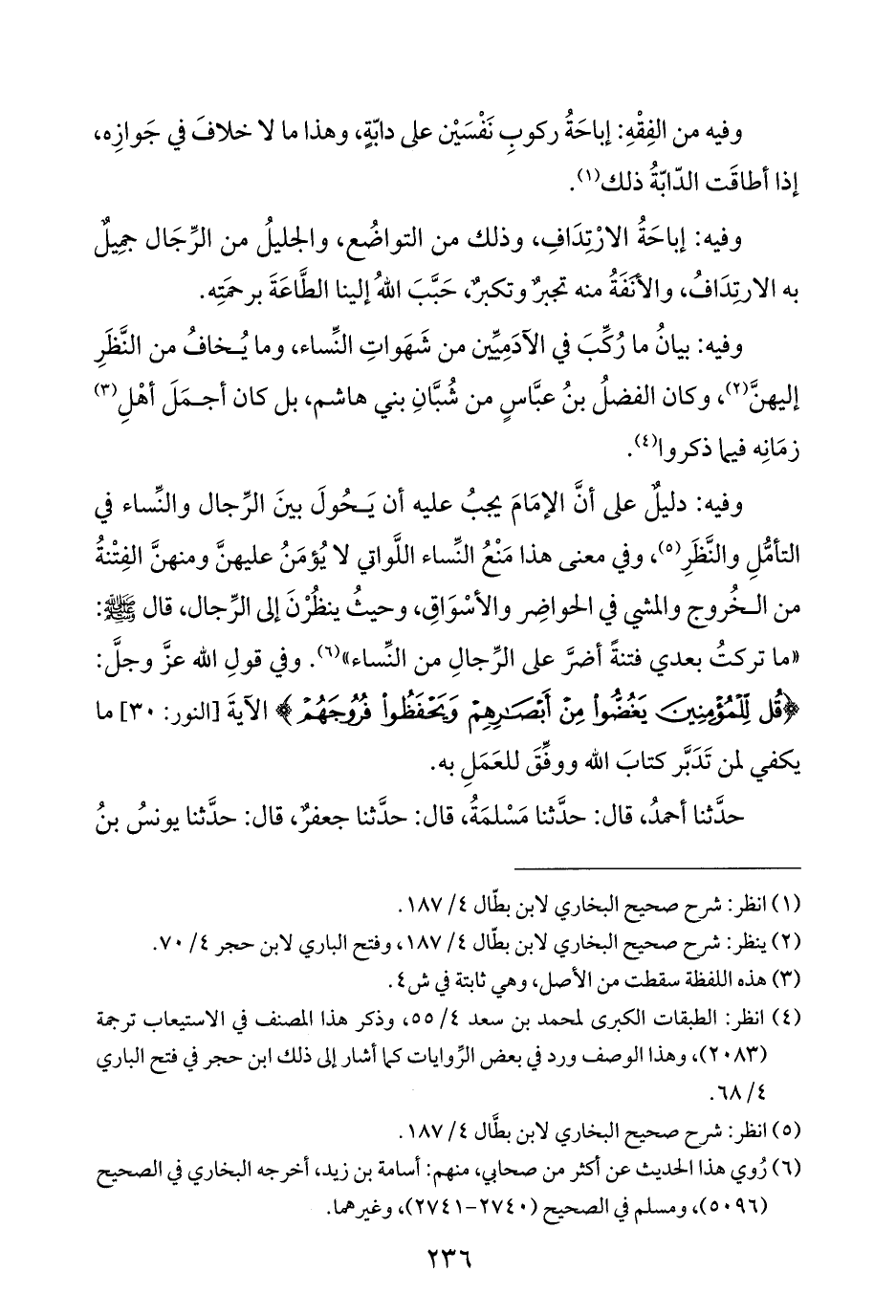 وفيه: بيانُ ما رُكِّبَ في الآدَمِيِّين من شَهَواتِ النِّساء، وما يُخافُ من النَّظَرِ إليهنَّ (¬٢)، وكان الفضلُ بنُ عبَّاسٍ من شُبَّانِ بني هاشم، بل كان أجمَلَ أهْلِ (¬٣) زمَانِه فيما ذكروا (¬٤).