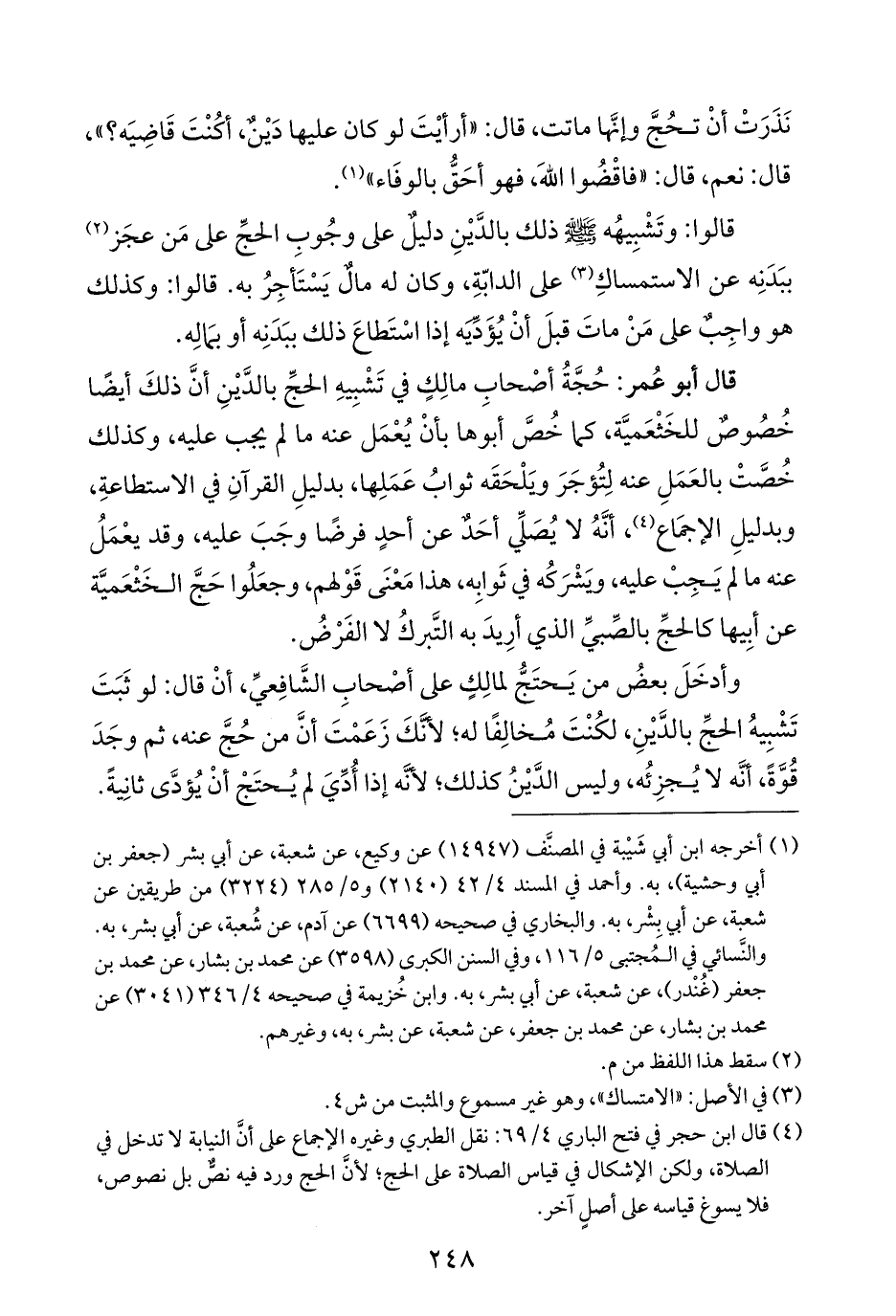 (¬٤) قال ابن حجر في فتح الباري ٤/ ٦٩: نقل الطبري وغيره الإجماع على أنَّ النيابة لا تدخل في الصلاة، ولكن الإشكال في قياس الصلاة على الحج؛ لأنَّ الحج ورد فيه نصٌّ بل نصوص، فلا يسوغ قياسه على أصلٍ آخر.