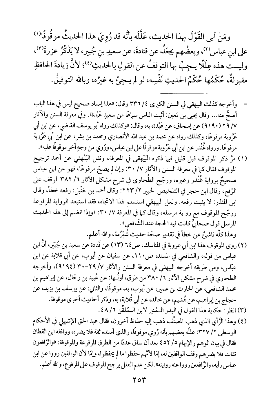 (¬٤) وهذا الرَّأي الذي ذهب المصنِّف ذهب إليه حفاظ آخرون، فقال عبد الحق الإشبيلي في الأحكام الوسطى ٢/ ٣٢٧: عللّه بعضهم بأنه رُوي موقوفًا، والذي أسنده ثقةٌ فلا يضره، ووافقه ابن القطان فقال في بيان الوهم والإيهام ٥/ ٤٥٢ بعد أن ساق عددًا من الطرق المرفوعة والموقوفة: "والرّافعون ثقات فلا يضرهم وقف الواقفين له، إمّا لأنَّهم حفظوا ما لَمْ يحفظوا، وإمّا لأنَّ الواقفين رووا عن ابن عباس رأيه، والرَّافعين رووا عنه روايته". لكن علم العلل يرجح الموقوف على المرفوع، واللّه أعلم.