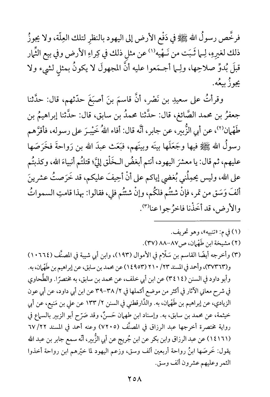 وقرأتُ على سعيدِ بن نَصْر، أنَّ قاسمَ بنَ أصبَغَ حدّثهم، قال: حَدَّثَنَا جعفرُ بن محمد الصَّائغ، قال: حَدَّثَنَا محمدُ بن سابق، قال: حَدَّثَنَا إبراهيمُ بن طَهْمان (¬٢)، عن أبي الزُّبير، عن جابر، أنَّه قال: أفاء اللهُ خَيْبرَ على رسوله، فأقرَّهم رسولُ الله - صَلَّى اللهُ عَلَيْهِ وَسَلَّمَ - فيها وجَعَلَها بينَه وبينَهم، فبَعَث عبدَ الله بن رَواحةَ فخَرَصَها عليهم، ثم قال: يا معشرَ اليهود، أنتم أبغضُ الخَلْق إليَّ، قتلتُم أنبياءَ الله، وكذبتُم على الله، وليس يحمِلُني بُغضي إياكم على أنْ أحِيفَ عليكم، قد خَرَصتُ عشرينَ ألفَ وَسَق من تمر، فإنْ شئتُم فلكُم، وإنْ شئتُم فلي، فقالوا: بهذا قامتِ السمواتُ والأرض، قد أخَذْنا فاخرُجوا عنا (¬٣).