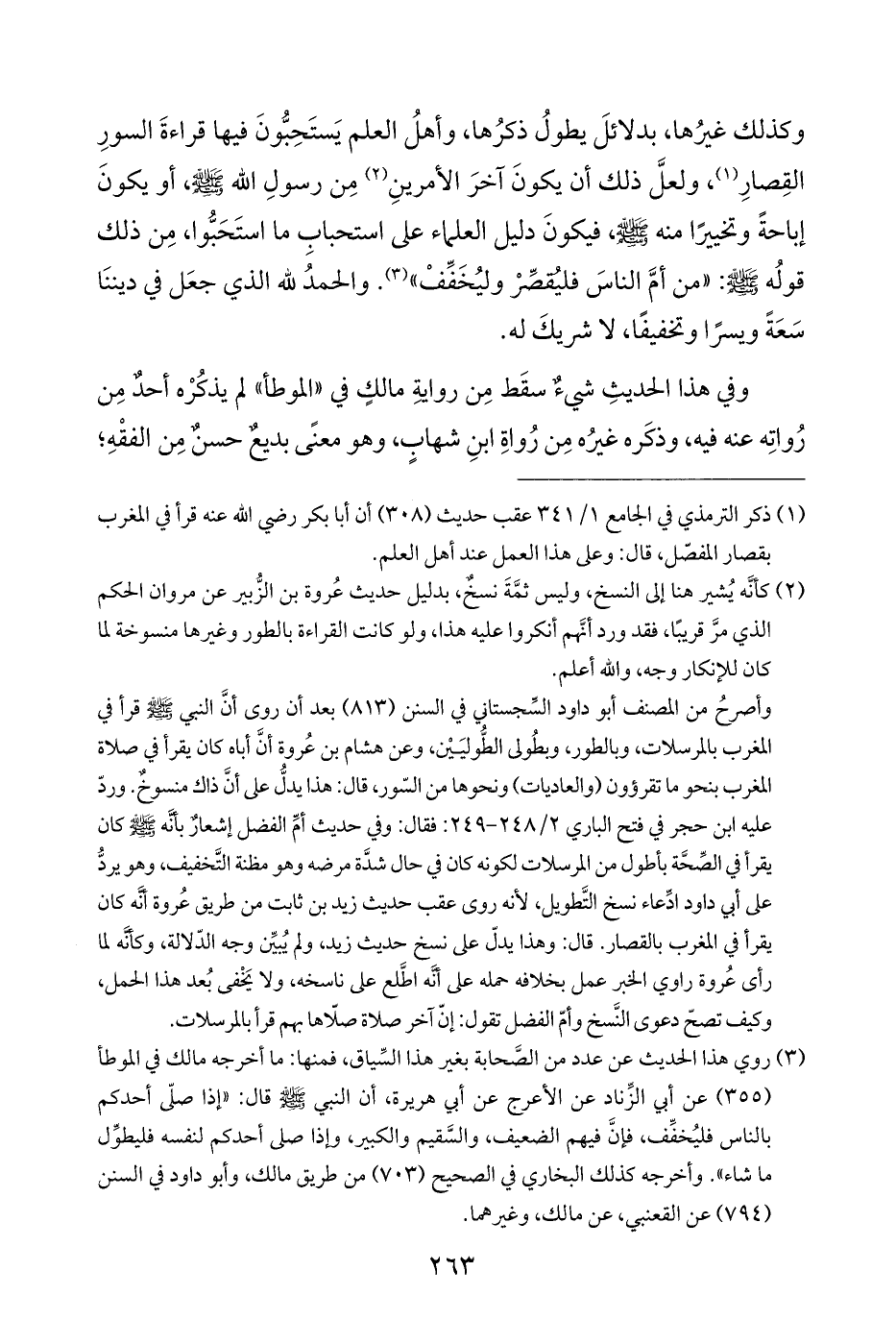 وأصرحُ من المصنّف أبو داود السِّجستاني في السنن (٨١٣) بعد أن روى أنَّ النبي - صَلَّى اللهُ عَلَيْهِ وَسَلَّمَ - قرأ في المغرب بالمرسلات، وبالطور، وبطُولى الطُّوليَيْن، وعن هشام بن عُروة أنَّ أباه كان يقرأ في صلاة المغرب بنحو ما تقرؤون (والعاديات) ونحوها من السّور، قال: هذا يدلُّ على أنَّ ذاك منسوخٌ. وردّ عليه ابن حجر في فتح الباري ٢/ ٢٤٨ - ٢٤٩: فقال: وفي حديث أمِّ الفضل إشعارٌ بأنه - صَلَّى اللهُ عَلَيْهِ وَسَلَّمَ - كان يقرأ في الصِّحَّة بأطول من المرسلات لكونه كان في حال شدَّة مرضه وهو مظنة التَّخفيف، وهو يردُّ على أبي داود ادِّعاء نسخ التَّطويل؛ لأنه روى عقب حديث زيد بن ثابت من طريق عُروة أنَّه كان يقرأ في المغرب بالقصار. قال: وهذا يدلّ على نسخ حديث زيد، ولم يُبيِّن وجه الدّلالة، وكأنه لما رأى عُروة راوي الخبر عمل بخلافه حمله على أنَّه اطَّلع على ناسخه، ولا يَخْفى بُعد هذا الحمل، وكيف تصحّ دعوى النَّسخ وأمّ الفضل تقول: إنّ آخر صلاة صلّاها بهم قرأ بالمرسلات.