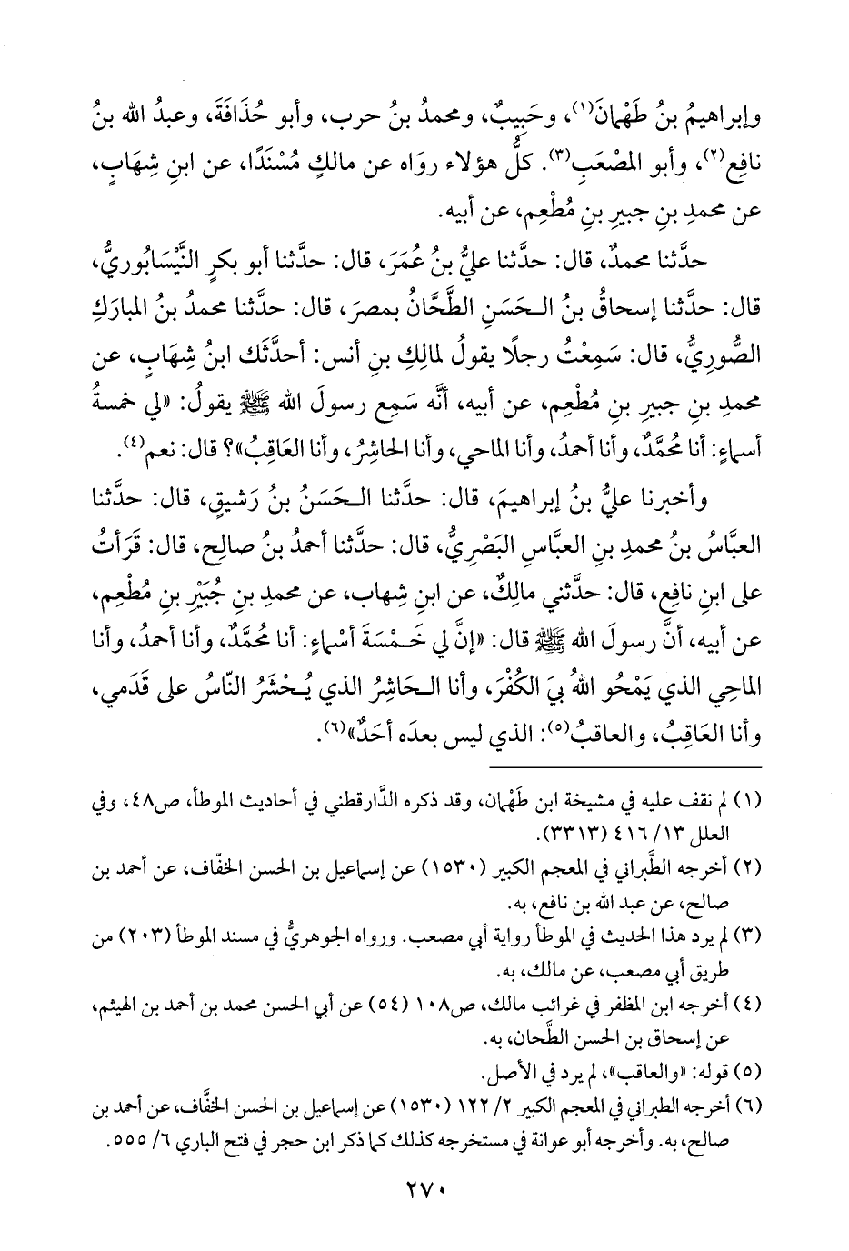 وإبراهيمُ بنُ طَهْمانَ (¬١)، وحَبِيبٌ، ومحمدُ بنُ حرب، وأبو حُذَافَةَ، وعبدُ الله بنُ نافِعٌ (¬٢)، وأبو المصْعَبِ (¬٣). كلُّ هؤلاء روَاه عن مالكٍ مُسْنَدًا، عن ابنِ شِهَابٍ، عن محمدِ بنِ جبيرِ بنِ مُطْعِم، عن أبيه. حَدَّثَنَا محمدٌ، قال: حَدَّثَنَا عليُّ بنُ عُمَرَ، قال: حَدَّثَنَا أبو بكرٍ النَّيْسَابُوريُّ، قال: حَدَّثَنَا إسحاقُ بنُ الحَسَنِ الطَّحَّانُ بمصرَ، قال: حَدَّثَنَا محمدُ بنُ المبارَكِ الصورِيُّ، قال: سَمِعْتُ رجلًا يقولُ لمالِكِ بنِ أنس: أحدَّثَك ابنُ شِهَابٍ، عن محمدِ بنِ جبيرِ بنِ مُطْعِم، عن أبيه، أنَّه سَمِع رسولَ الله - صَلَّى اللهُ عَلَيْهِ وَسَلَّمَ - يقولُ: "لي خمسةُ أسماءٍ: أنا مُحَمَّدٌ، وأنا أحمدُ، وأنا الماحي، وأنا الحاشِرُ، وأنا العَاقِبُ"؟ قال: نعم (¬٤).