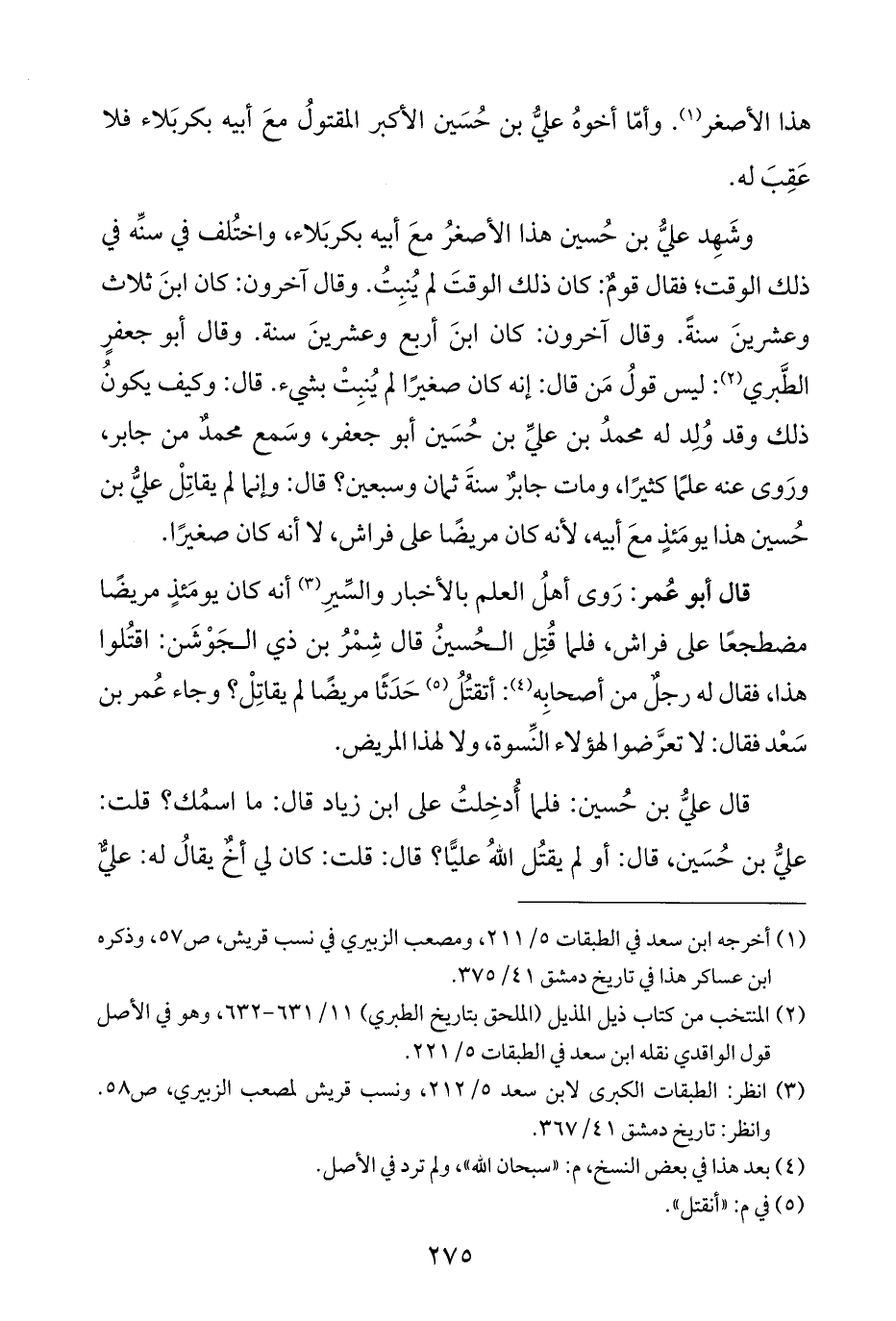 وشَهِد عليُّ بن حُسين هذا الأصغرُ معَ أبيه بكربَلاء، واختُلف في سنِّه في ذلك الوقت؛ فقال قومٌ: كان ذلك الوقتَ لم يُنبِتُ. وقال آخرون: كان ابنَ ثلاث وعشرينَ سنةً. وقال آخرون: كان ابنَ أربع وعشرينَ سنة. وقال أبو جعفرٍ الطَّبري (¬٢): ليس قولُ مَن قال: إنه كان صغيرًا لم يُنبِتْ بشيء. قال: وكيف يكونُ ذلك وقد وُلد له محمدُ بن عليِّ بن حُسَين أبو جعفر، وسَمع محمدٌ من جابر، ورَوى عنه علمًا كثيرًا، ومات جابرٌ سنةَ ثمان وسبعين؟ قال: وإنما لم يقاتِلْ عليُّ بن حُسين هذا يومَئذٍ معَ أبيه، لأنه كان مريضًا على فراش، لا أنه كان صغيرًا.