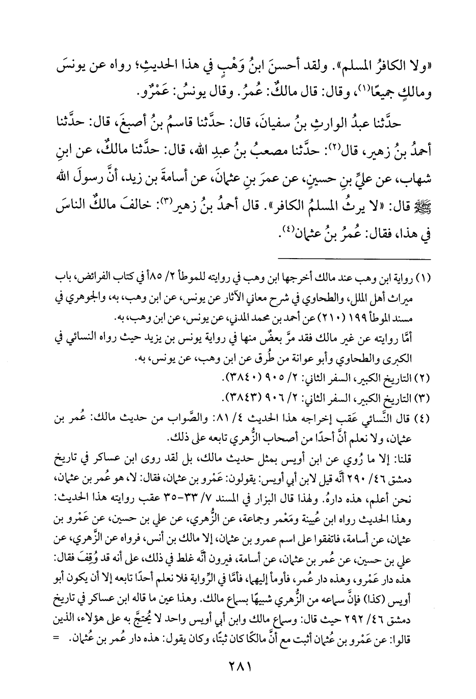 حدَّثنا عبدُ الوارثِ بنُ سفيانَ، قال: حدَّثنا قاسمُ بنُ أصبغَ، قال: حدَّثنا أحمدُ بنُ زهير، قال (¬٢): حدَّثنا مصعبُ بنُ عبدِ الله، قال: حدَّثنا مالكٌ، عن ابنِ شهاب، عن عليِّ بنِ حسينٍ، عن عمرَ بنِ عثمانَ، عن أسامةَ بن زيد، أنَّ رسولَ الله - صلى الله عليه وسلم - قال: "لا يرثُ المسلمُ الكافر". قال أحمدُ بنُ زهير (¬٣): خالفَ مالكٌ الناسَ في هذا، فقال: عُمرُ بنُ عثمان (¬٤).