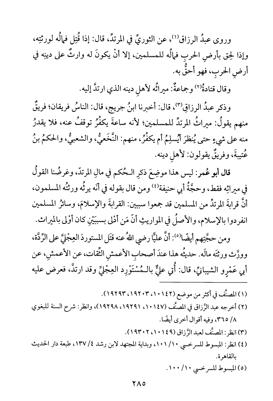 وذكر عبدُ الرزاقِ (¬٣)، قال: أخبرنا ابنُ جريج، قال: الناسُ فريقان؛ فريقٌ منهم يقولُ: ميراثُ المرتدِّ للمسلمين؛ لأنه ساعةَ يكفُرُ توقفُ عنه، فلا يقدرُ منه على شيءٍ حتى يُنظرَ أيُسلِمُ أم يكفُرُ، منهم: النَّخَعيُّ، والشعبيُّ، والحكمُ بنُ عُتيبةَ، وفريقٌ يقولون: لأهلِ دينه.