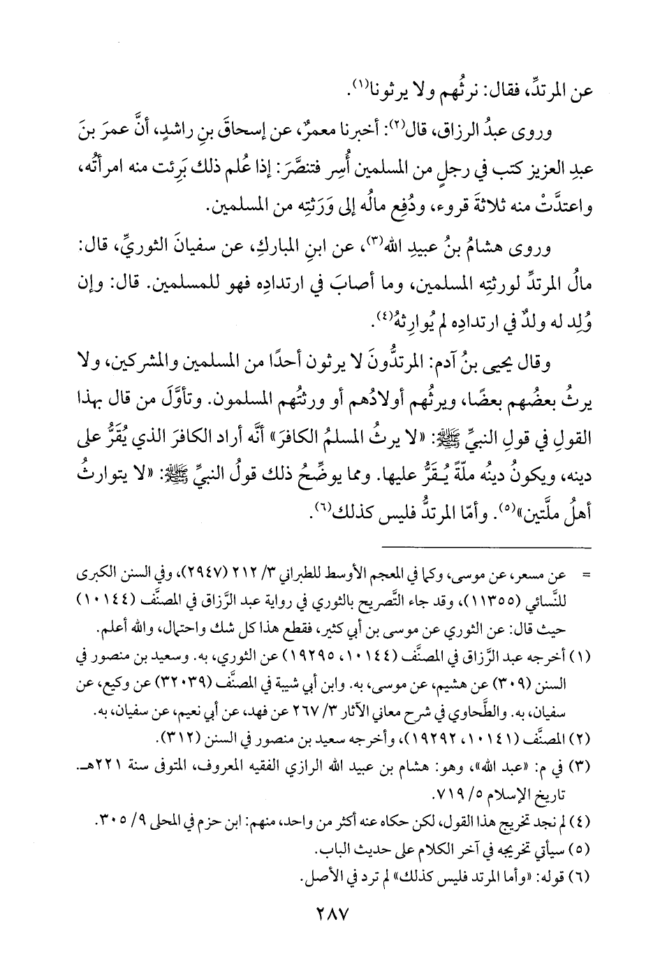 وروى هشامُ بنُ عبيدِ الله (¬٣)، عن ابنِ المباركِ، عن سفيانَ الثوريِّ، قال: مالُ المرتدِّ لورثتِه المسلمين، وما أصابَ في ارتدادِه فهو للمسلمين. قال: وإن وُلِد له ولدٌ في ارتدادِه لم يُوارِثهُ (¬٤).