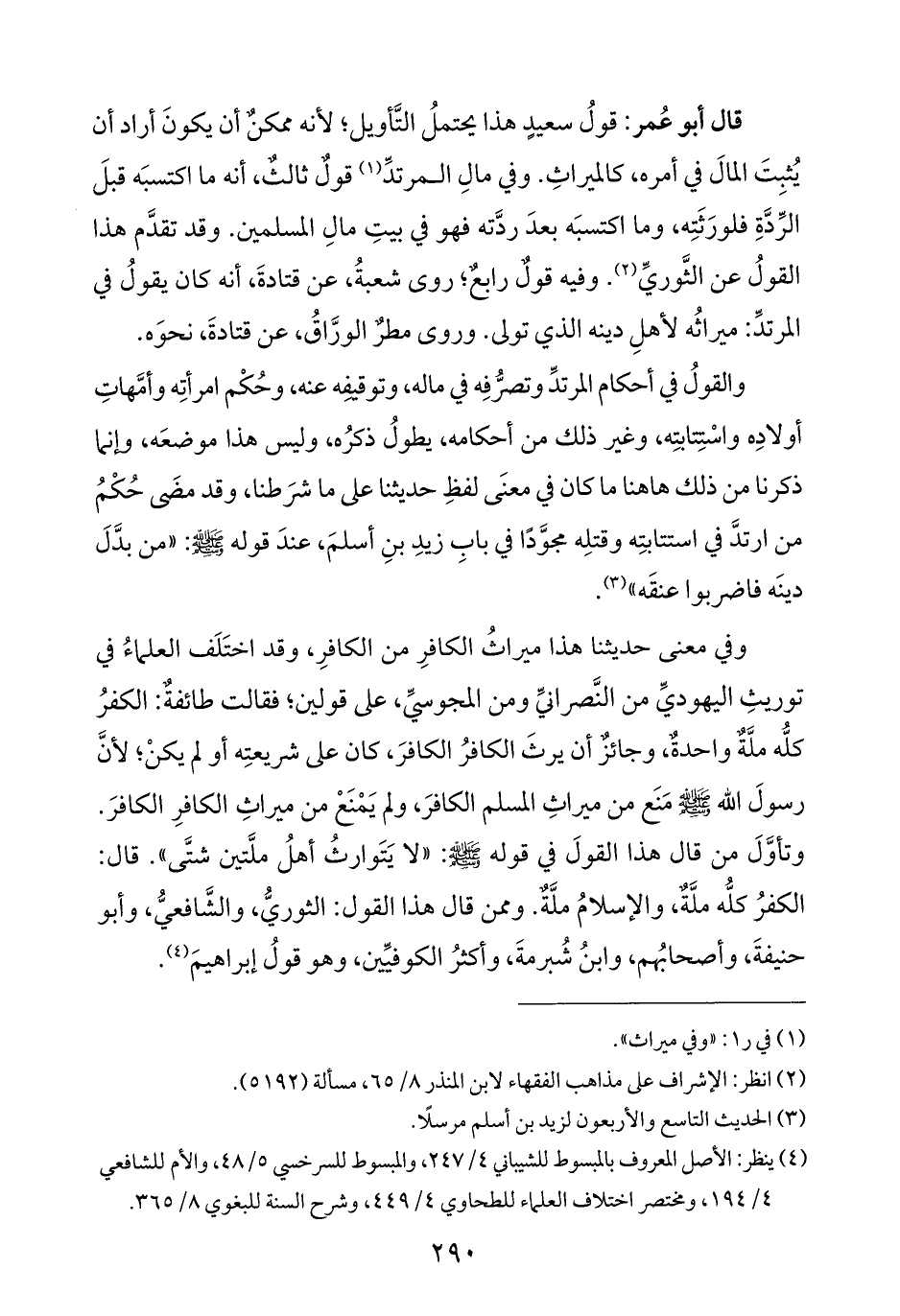 وفي معنى حديثنا هذا ميراثُ الكافرِ من الكافرِ، وقد اختَلَف العلماءُ في توريثِ اليهوديِّ من النَّصرانيِّ ومن المجوسيِّ، على قولين؛ فقالت طائفةٌ: الكفرُ كلُّه ملَّةٌ واحدةٌ، وجائزٌ أن يرثَ الكافرُ الكافرَ، كان على شريعتِه أو لم يكنْ؛ لأنَّ رسولَ الله - صلى الله عليه وسلم - مَنَع من ميراثِ المسلم الكافرَ، ولم يَمْنَعْ من ميراثِ الكافرِ الكافرَ. وتأوَّلَ من قال هذا القولَ في قوله - صلى الله عليه وسلم -: "لا يَتَوارثُ أهلُ ملَّتين شتَّى". قال: الكفرُ كلُّه ملَّةٌ، والإسلامُ ملَّةٌ. وممن قال هذا القول: الثوريُّ، والشَّافعيُّ، وأبو حنيفةَ، وأصحابُهم، وابنُ شُبرمةَ، وأكثرُ الكوفيِّين، وهو قولُ إبراهيمَ (¬٤).