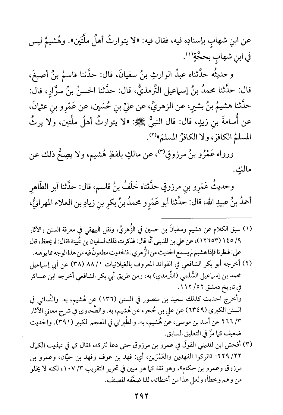 وحديثُه حدَّثناه عبدُ الوارثِ بنُ سفيانَ، قال: حدَّثنا قاسمُ بنُ أصبغَ، قال: حدَّثنا محمدُ بنُ إسماعيل التِّرمذيُّ، قال: حدَّثنا الحسنُ بنُ سوَّارٍ، قال: حدَّثنا هشيمُ بنُ بشيرٍ، عن الزهريِّ، عن عليِّ بنِ حُسَين، عن عَمْرِو بنِ عثمانَ، عن أُسامةَ بنِ زيدٍ، قال: قال النبيُّ - صلى الله عليه وسلم -: "لا يتوارثُ أهلُ ملَّتين، ولا يرثُ المسلمُ الكافرَ، ولا الكافرُ المسلمَ" (¬٢).