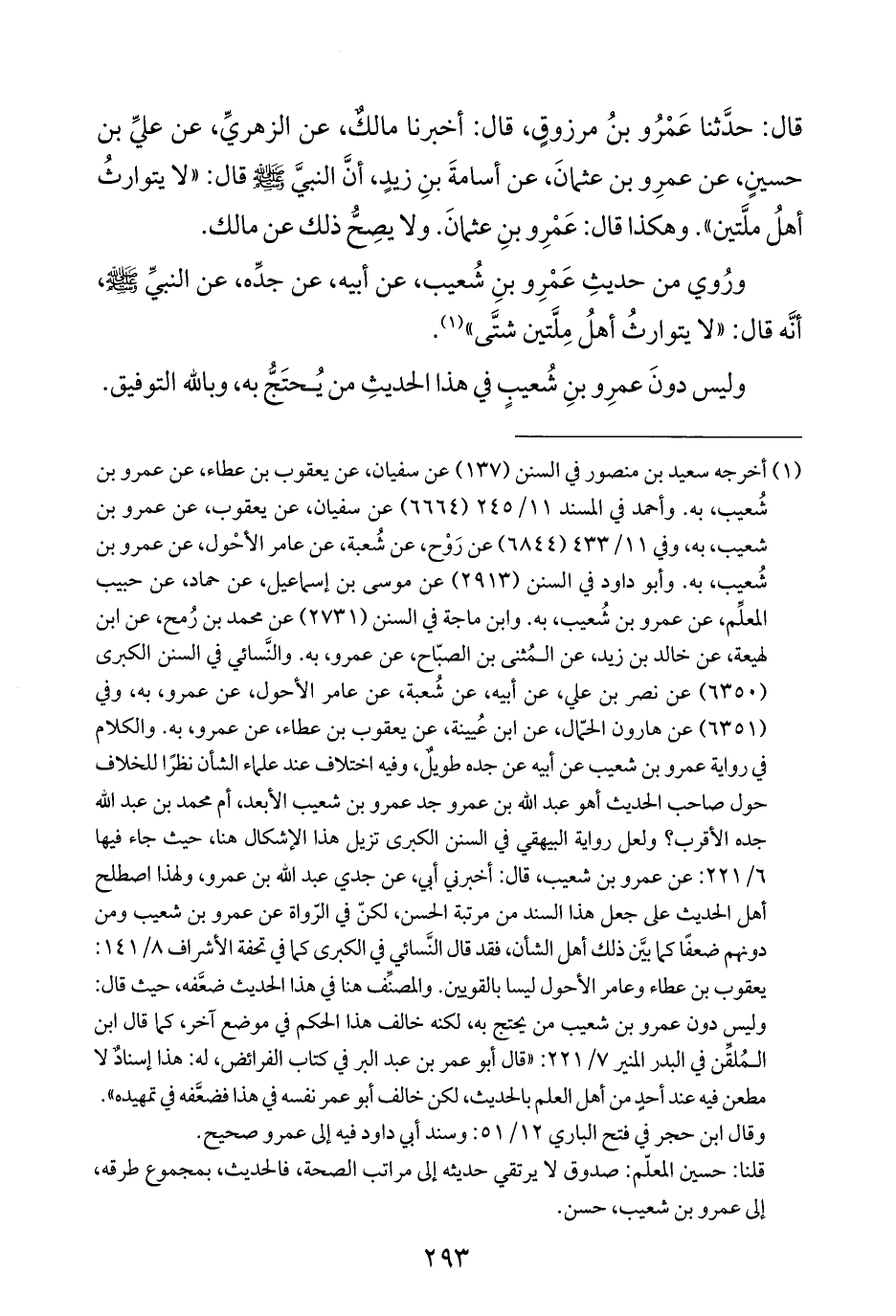 قال: حدَّثنا عَمْرُو بنُ مرزوقٍ، قال: أخبرنا مالكٌ، عن الزهريِّ، عن عليِّ بن حسينٍ، عن عمرِو بن عثمانَ، عن أسامةَ بنِ زيدٍ، أنَّ النبيَّ - صلى الله عليه وسلم - قال: "لا يتوارثُ أهلُ ملَّتين". وهكذا قال: عَمْرِو بنِ عثمانَ. ولا يصِحُّ ذلك عن مالك.