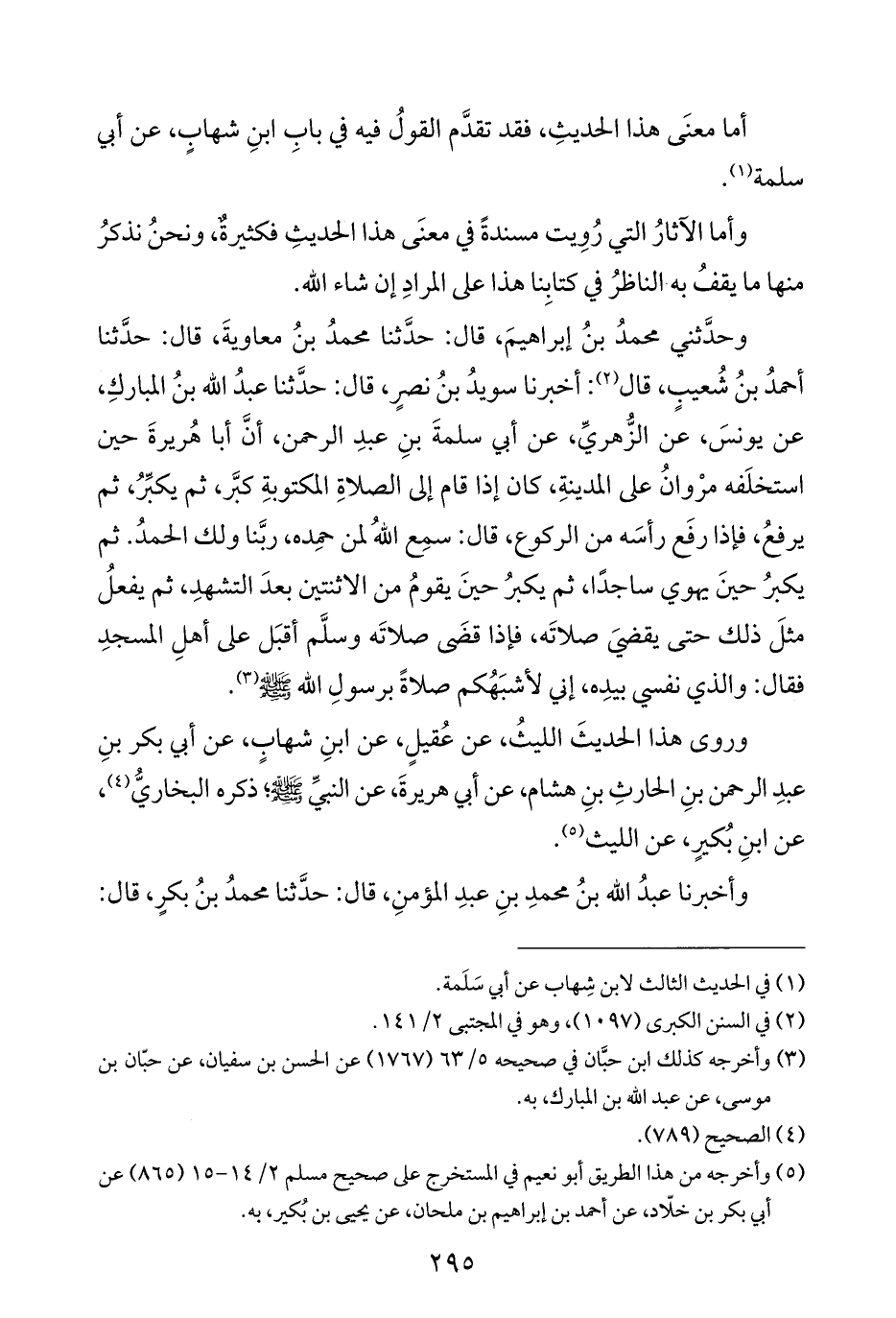 وحدَّثني محمدُ بنُ إبراهيمَ، قال: حدَّثنا محمدُ بنُ معاويةَ، قال: حدَّثنا أحمدُ بنُ شُعيبٍ، قال (¬٢): أخبرنا سويدُ بنُ نصرٍ، قال: حدَّثنا عبدُ الله بنُ المباركِ، عن يونسَ، عن الزُّهريِّ، عن أبي سلمةَ بنِ عبدِ الرحمن، أنَّ أبا هُريرةَ حين استخلَفه مرْوانُ على المدينةِ، كان إذا قام إلى الصلاةِ المكتوبةِ كبَّر، ثم يكبِّرُ، ثم يرفعُ، فإذا رفَع رأسَه من الركوع، قال: سمِع اللهُ لمن حمِده، ربَّنا ولك الحمدُ. ثم يكبرُ حينَ يهوي ساجدًا، ثم يكبرُ حينَ يقومُ من الاثنتين بعدَ التشهدِ، ثم يفعلُ مثلَ ذلك حتى يقضيَ صلاتَه، فإذا قضَى صلاتَه وسلَّم أقبَل على أهلِ المسجدِ فقال: والذي نفسي بيدِه، إني لأشبَهُكم صلاةً برسولِ الله - صلي الله عليه وسلم - (¬٣).