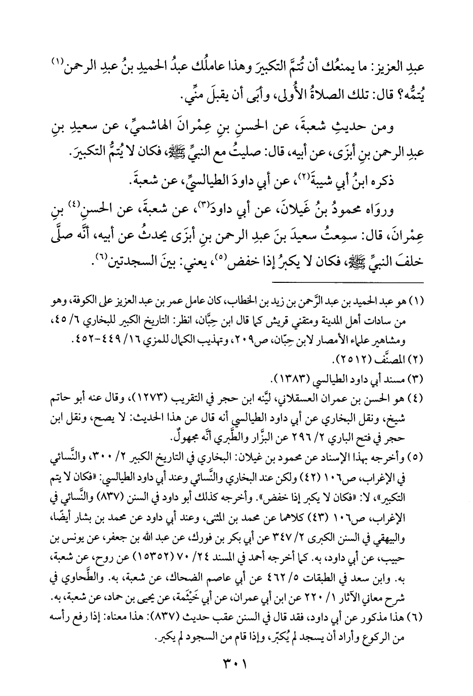 (¬٥) وأخرجه بهذا الإسناد عن محمود بن غيلان: البخاري في التاريخ الكبير ٢/ ٣٠٠، والنَّسائي في الإغراب، ص ١٠٦ (٤٢) ولكن عند البخاري والنَّسائي وعند أبي داود الطيالسي: "فكان لا يتم التكبير"، لا: "فكان لا يكبر إذا خفض". وأخرجه كذلك أبو داود في السنن (٨٣٧) والنَّسائي في الإغراب، ص ١٠٦ (٤٣) كلاهما عن محمد بن المثنى، وعند أبي داود عن محمد بن بشار أيضًا، والبيهقي في السنن الكبرى ٢/ ٣٤٧ عن أبي بكر بن فورك، عن عبد الله بن جعفر، عن يونس بن حبيب، عن أبي داود، به. كما أخرجه أحمد في المسند ٢٤/ ٧٠ (١٥٣٥٢) عن روح، عن شعبة، به. وابن سعد في الطبقات ٥/ ٤٦٢ عن أبي عاصم الضحاك، عن شعبة، به. والطَّحاوي في شرح معاني الآثار ١/ ٢٢٠ عن ابن أبي عمران، عن أبي خَيْثَمة، عن يحيى بن حماد، عن شعبة، به.