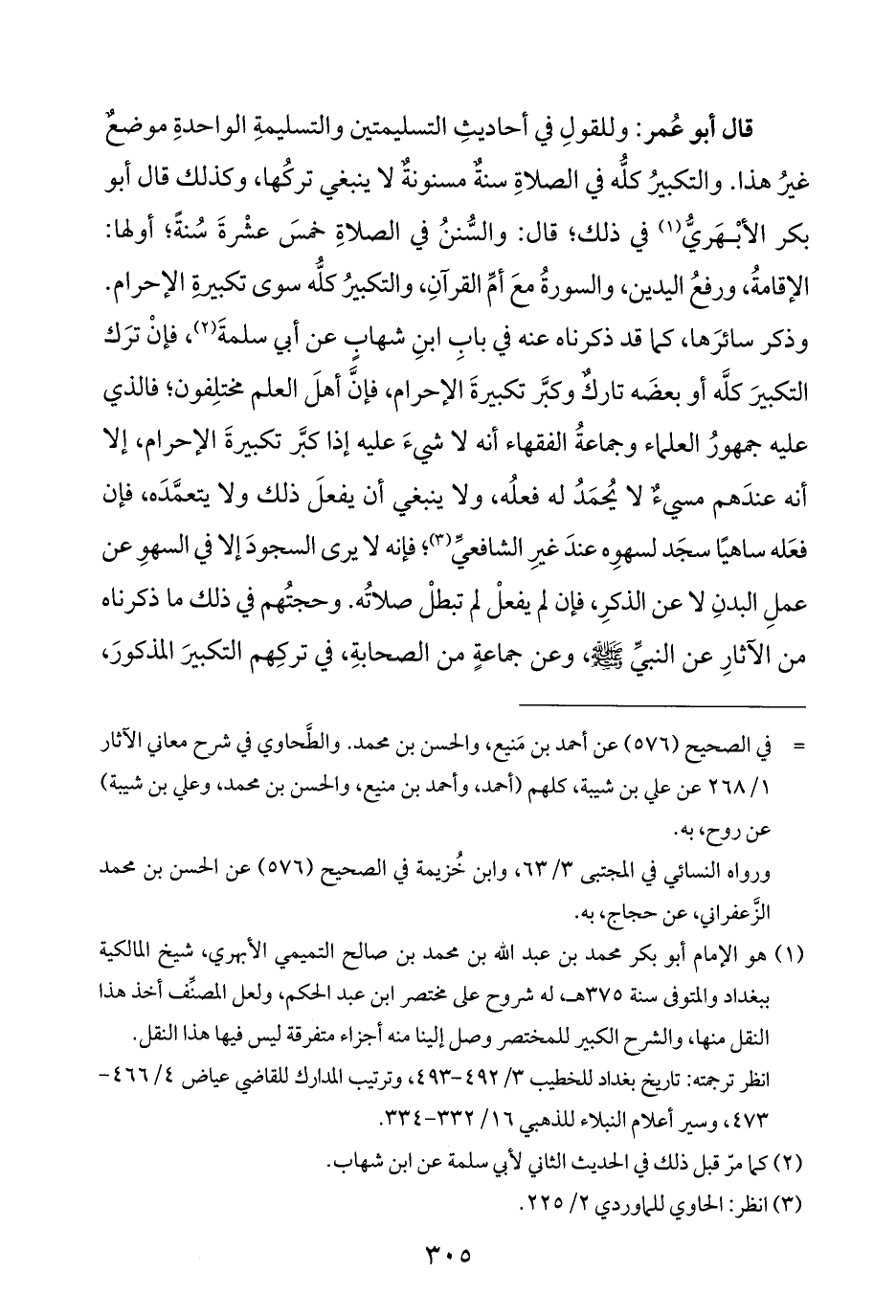 (¬١) هو الإمام أبو بكر محمد بن عبد الله بن محمد بن صالح التميمي الأبهري، شيخ المالكية ببغداد والمتوفى سنة ٣٧٥ هـ، له شروح على مختصر ابن عبد الحكم، ولعل المصنِّف أخذ هذا النقل منها، والشرح الكبير للمختصر وصل إلينا منه أجزاء متفرقة ليس فيها هذا النقل.