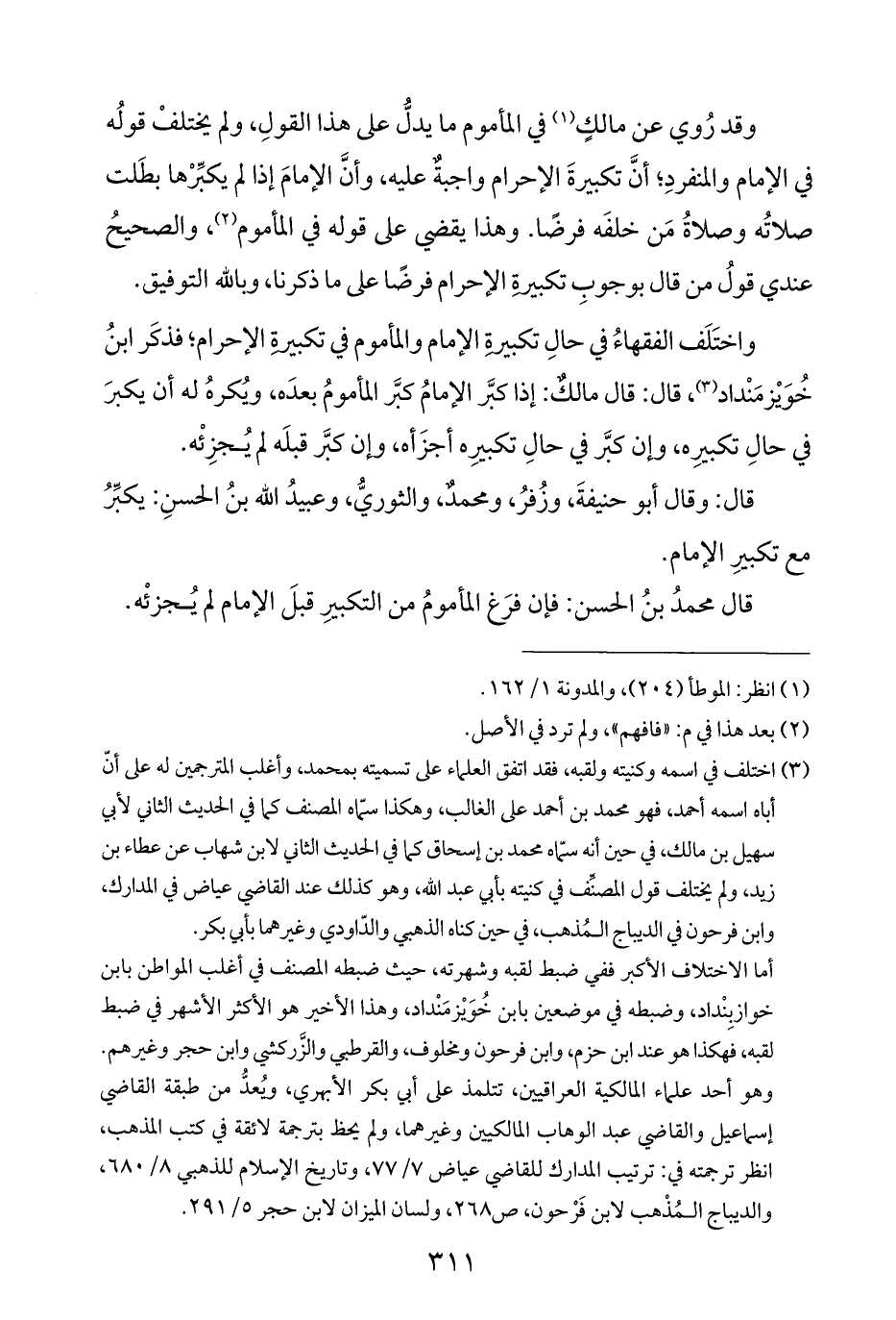 واختَلَف الفقهاءُ في حالِ تكبيرةِ الإمام والمأموم في تكبيرةِ الإحرام؛ فذكَر ابنُ خُوَيْزمَنْداد (¬٣)، قال: قال مالكٌ: إذا كبَّر الإمامُ كبَّر المأمومُ بعدَه، ويُكرهُ له أن يكبرَ في حالِ تكبيرِه، وإن كبَّر في حالِ تكبيرِه أجزَأه، وإن كبَّر قبلَه لم يُجزِئْه.