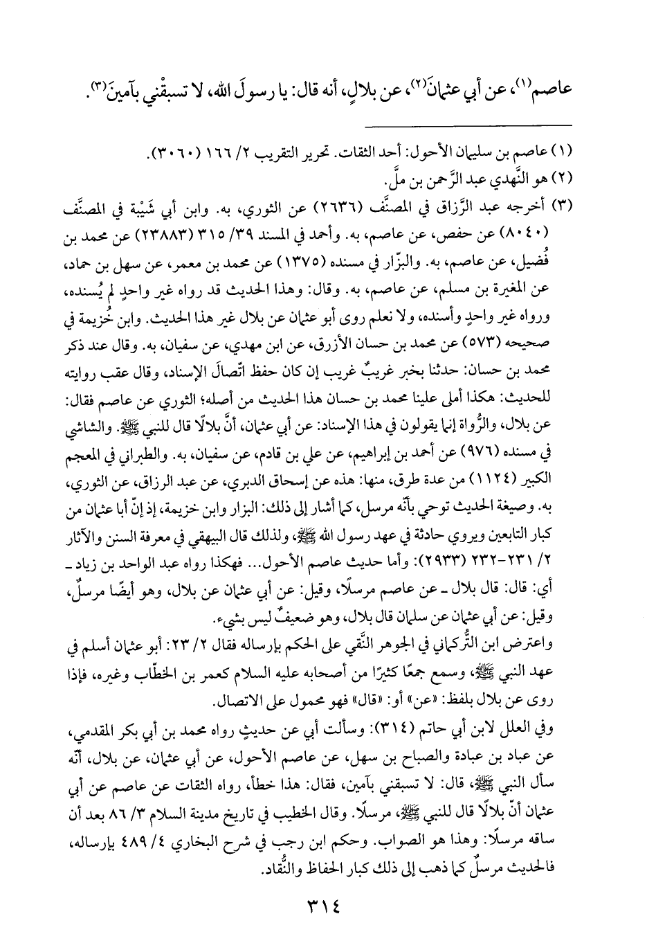 وفي العلل لابن أبي حاتم (٣١٤): وسألت أبي عن حديثٍ رواه محمد بن أبي بكر المقدمي، عن عباد بن عبادة والصباح بن سهل، عن عاصم الأحول، عن أبي عثمان، عن بلال، أنّه سأل النبي - صلى الله عليه وسلم -، قال: لا تسبقني بآمين، فقال: هذا خطأ، رواه الثقات عن عاصم عن أبي عثمان أنّ بلالًا قال للنبي - صلى الله عليه وسلم -، مرسلًا. وقال الخطيب في تاريخ مدينة السلام ٣/ ٨٦ بعد أن ساقه مرسلًا: وهذا هو الصواب. وحكم ابن رجب في شرح البخاري ٤/ ٤٨٩ بإرساله، فالحديث مرسلٌ كما ذهب إلى ذلك كبار الحفاظ والنُّقاد.