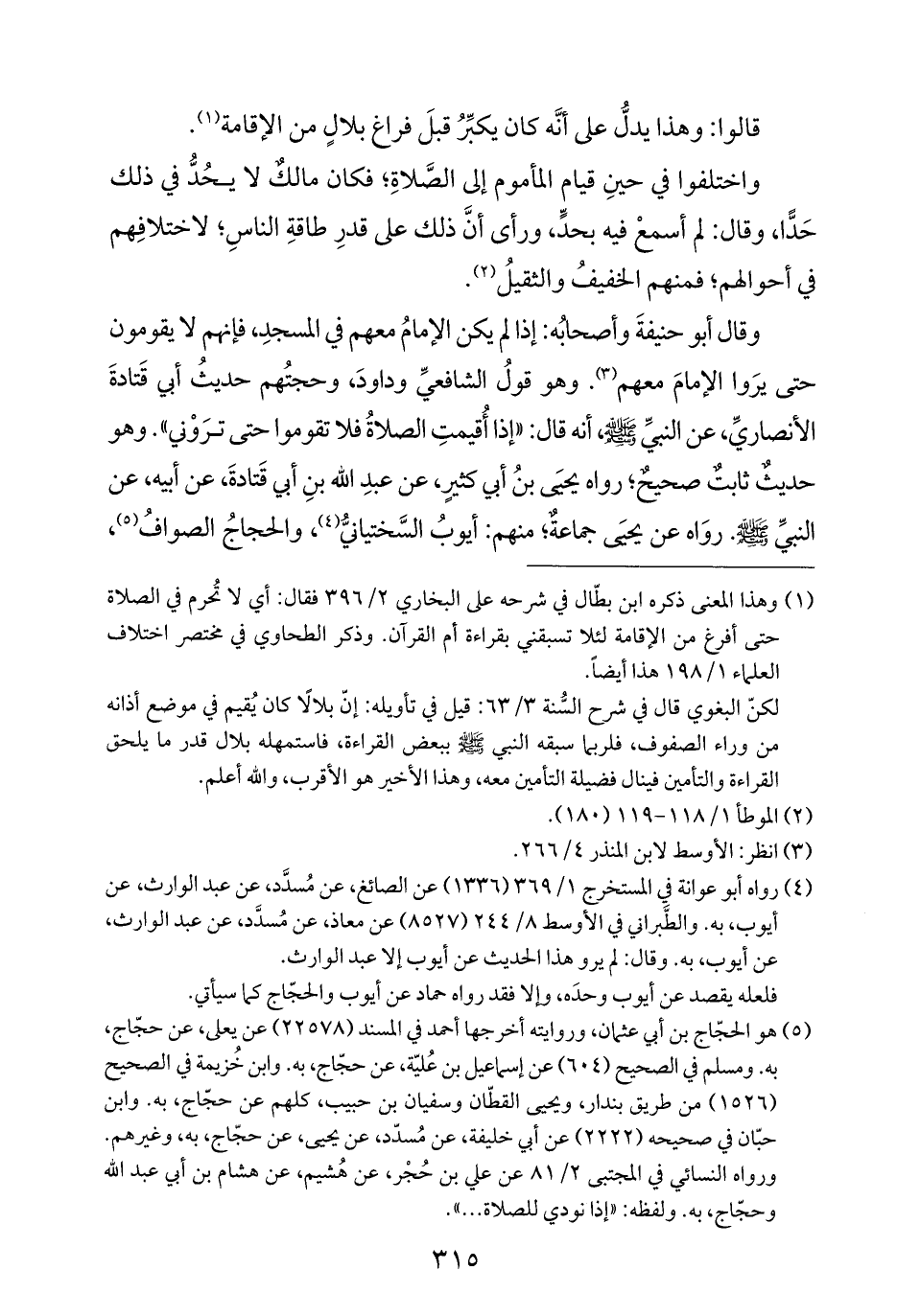 وقال أبو حنيفةَ وأصحابُه: إذا لم يكن الإمامُ معهم في المسجدِ، فإنهم لا يقومون حتى يرَوا الإمامَ معهم (¬٣). وهو قولُ الشافعيِّ وداودَ، وحجتُهم حديثُ أبي قَتادةَ الأنصاريِّ، عن النبيِّ - صلي الله عليه وسلم -، أنه قال: "إذا أُقيمتِ الصلاةُ فلا تقوموا حتى ترَوْني". وهو حديثٌ ثابتٌ صحيحٌ؛ رواه يحيَى بنُ أبي كثيرٍ، عن عبدِ الله بنِ أبي قَتادةَ، عن أبيه، عن النبيِّ - صلي الله عليه وسلم -. روَاه عن يحيَى جماعةٌ؛ منهم: أيوبُ السَّختيانيُّ (¬٤)، والحجاجُ الصوافُ (¬٥)،