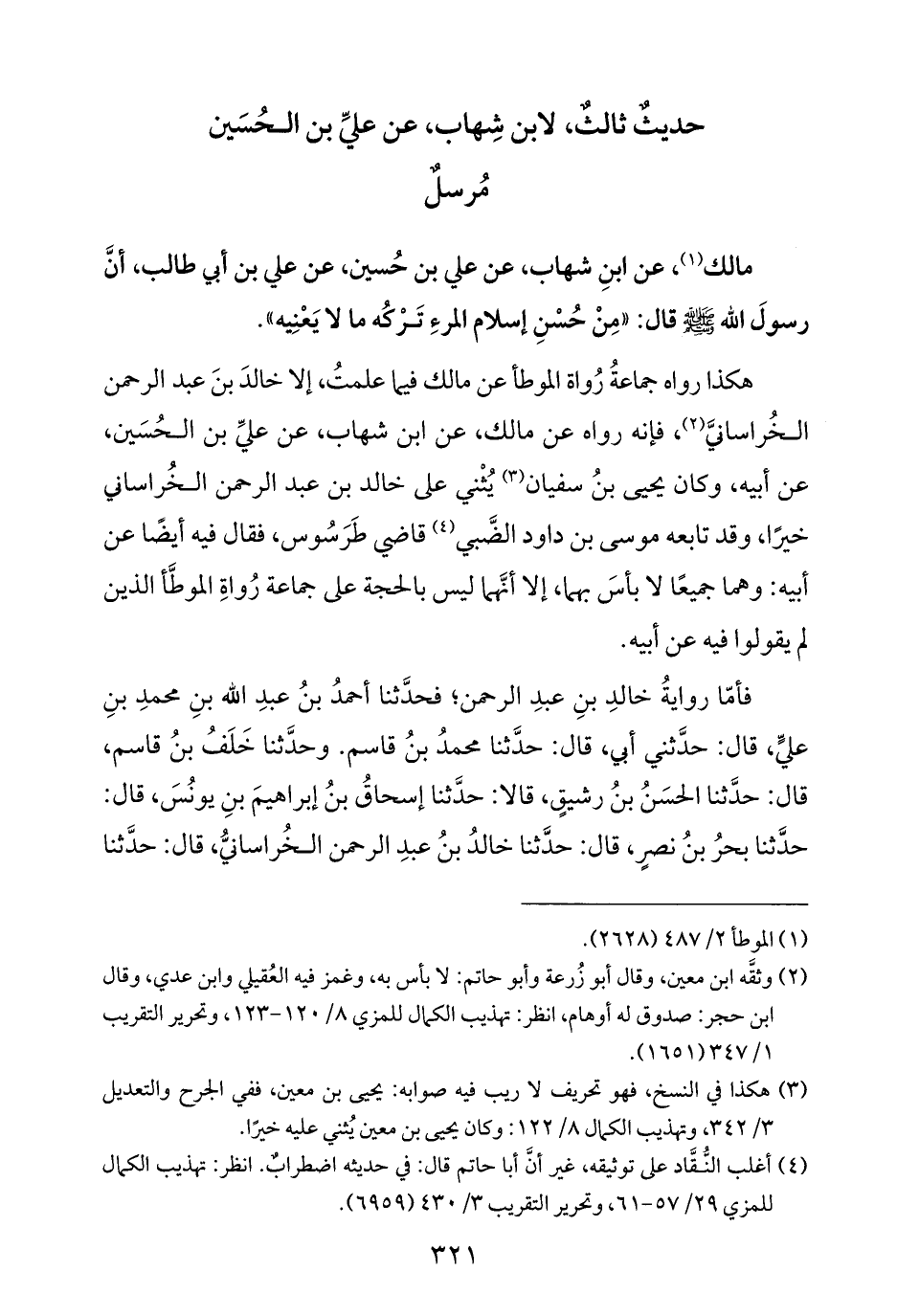 مالك (¬١)، عن ابنِ شهاب، عن علي بن حُسين، عن علي بن أبي طالب، أنَّ رسولَ الله - صلى الله عليه وسلم - قال: "مِنْ حُسْنِ إسلام المرءِ تَرْكُه ما لا يَعْنِيه".