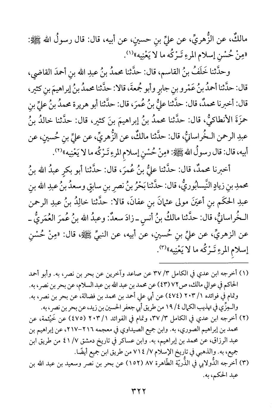 وحدَّثنا خَلَفُ بنُ القاسم، قال: حدَّثنا محمدُ بنُ عبدِ الله بنِ أحمدَ القاضي، قال: حدَّثنا أحمدُ بنُ عَمْرو بنِ جابرٍ وأبو جُمعةَ، قالا: حدَّثنا محمدُ بنُ إبراهيمَ بنِ كثير، قال: أخبرنا محمدٌ، قال: حدَّثنا عليُّ بنُ عُمرَ، قال: حدَّثنا أبو هريرة محمدُ بنُ عليِّ بنِ حمزَةَ الأنطاكيُّ، قال: حدَّثنا محمدُ بنُ إبراهيمَ بنَ كثير، قال: حدَّثنا خالدُ بنُ عبدِ الرحمن الخُراسانيُّ، قال: حدَّثنا مالكٌ، عن الزُّهريِّ، عن عليِّ بنِ حُسينٍ، عن أبيه، قال: قال رسولُ الله - صلى الله عليه وسلم -: "مِنْ حُسْنِ إسلامِ المرءِ تَرْكُه ما لا يَعْنِيه" (¬٢).