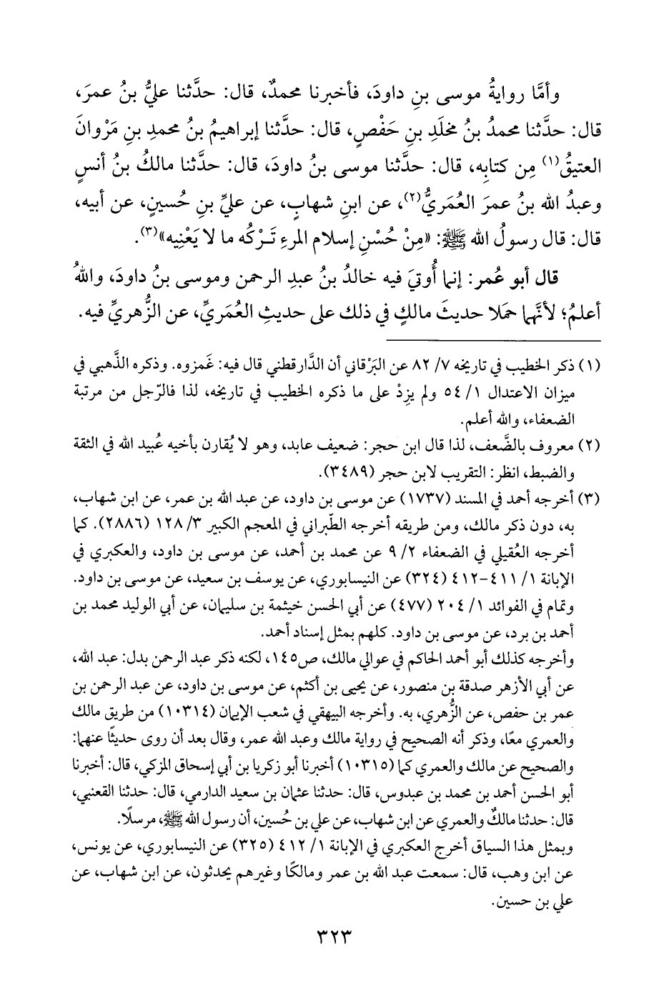 وأمَّا روايةُ موسى بنِ داودَ، فأخبرنا محمدٌ، قال: حدَّثنا عليُّ بنُ عمرَ، قال: حدَّثنا محمدُ بنُ مخلَدِ بنِ حَفْصٍ، قال: حدَّثنا إبراهيمُ بنُ محمدِ بنِ مَرْوانَ العتيقُ (¬١) مِن كتابِه، قال: حدَّثنا موسى بنُ داودَ، قال: حدَّثنا مالكُ بنُ أنسٍ وعبدُ الله بنُ عمرَ العُمَريُّ (¬٢)، عن ابنِ شهابٍ، عن عليِّ بنِ حُسينٍ، عن أبيه، قال: قال رسولُ الله - صلى الله عليه وسلم -: "مِنْ حُسْنِ إسلام المرءِ تَرْكُه ما لا يَعْنِيه" (¬٣).