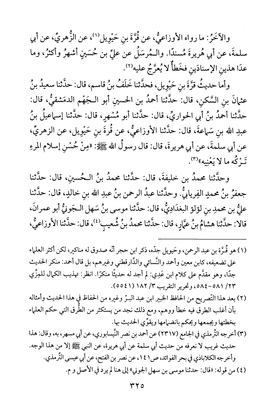 وأما حديثُ قرَّةَ بنِ حَيْوِيل، فحدَّثنا خَلَفُ بنُ قاسم، قال: حدَّثنا سعيدُ بنُ عثمانَ بنِ السَّكنِ، قال: حدَّثنا أحمدُ بن الحسينِ أبو الجَهْم الدمَشقيُّ، قال: حدَّثنا أحمدُ بنُ أبي الحواريِّ، قال: حدَّثنا أبو مُسْهرٍ، قال: حدَّثنا إسماعيلُ بنُ عبدِ الله بنِ سَماعةَ، قال: حدَّثنا الأوزاعيُّ، عن قُرةَ بنِ حَيْوِيل، عن الزهريِّ، عن أبي سلمةَ، عن أبي هريرةَ، قال: قال رسولُ الله - صلى الله عليه وسلم -: "مِنْ حُسْنِ إسلام المرءِ تَرْكُه ما لا يَعْنِيه" (¬٣).