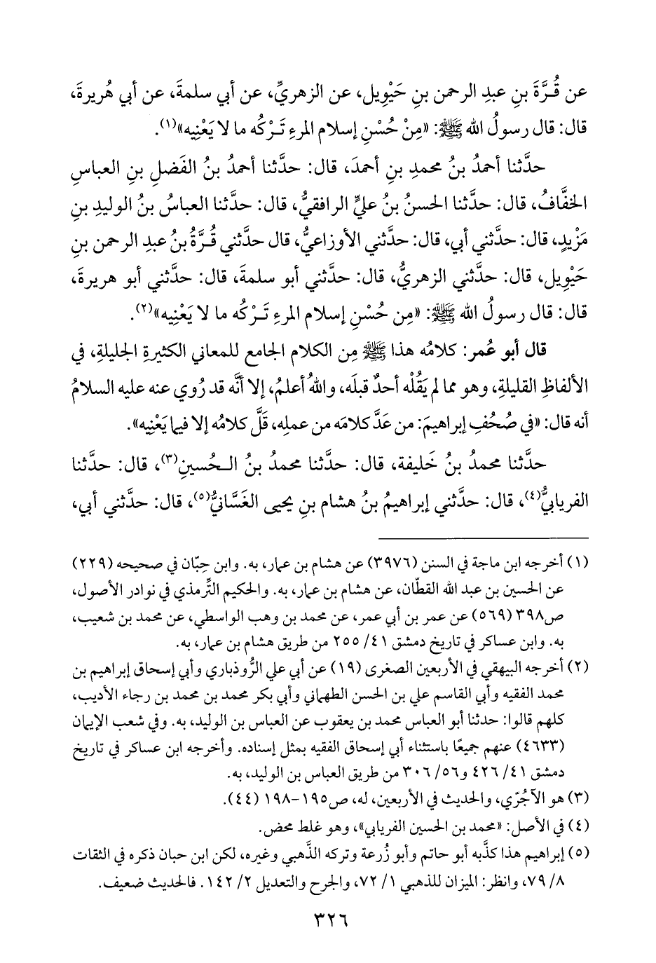 حدَّثنا أحمدُ بنُ محمدِ بنِ أحمدَ، قال: حدَّثنا أحمدُ بنُ الفَضلِ بنِ العباسِ الخفَّافُ، قال: حدَّثنا الحسنُ بنُ عليٍّ الرافقيُّ، قال: حدَّثنا العباسُ بنُ الوليدِ بنِ مَزْيدٍ، قال: حدَّثني أبي، قال: حدَّثني الأوزاعيُّ، قال حدَّثني قُرَّةُ بنُ عبدِ الرحمن بنِ حَيْوِيل، قال: حدَّثني الزهريُّ، قال: حدَّثني أبو سلمةَ، قال: حدَّثني أبو هريرةَ، قال: قال رسولُ الله - صلى الله عليه وسلم -: "مِن حُسْنِ إسلام المرءِ تَرْكُه ما لا يَعْنِيه" (¬٢).