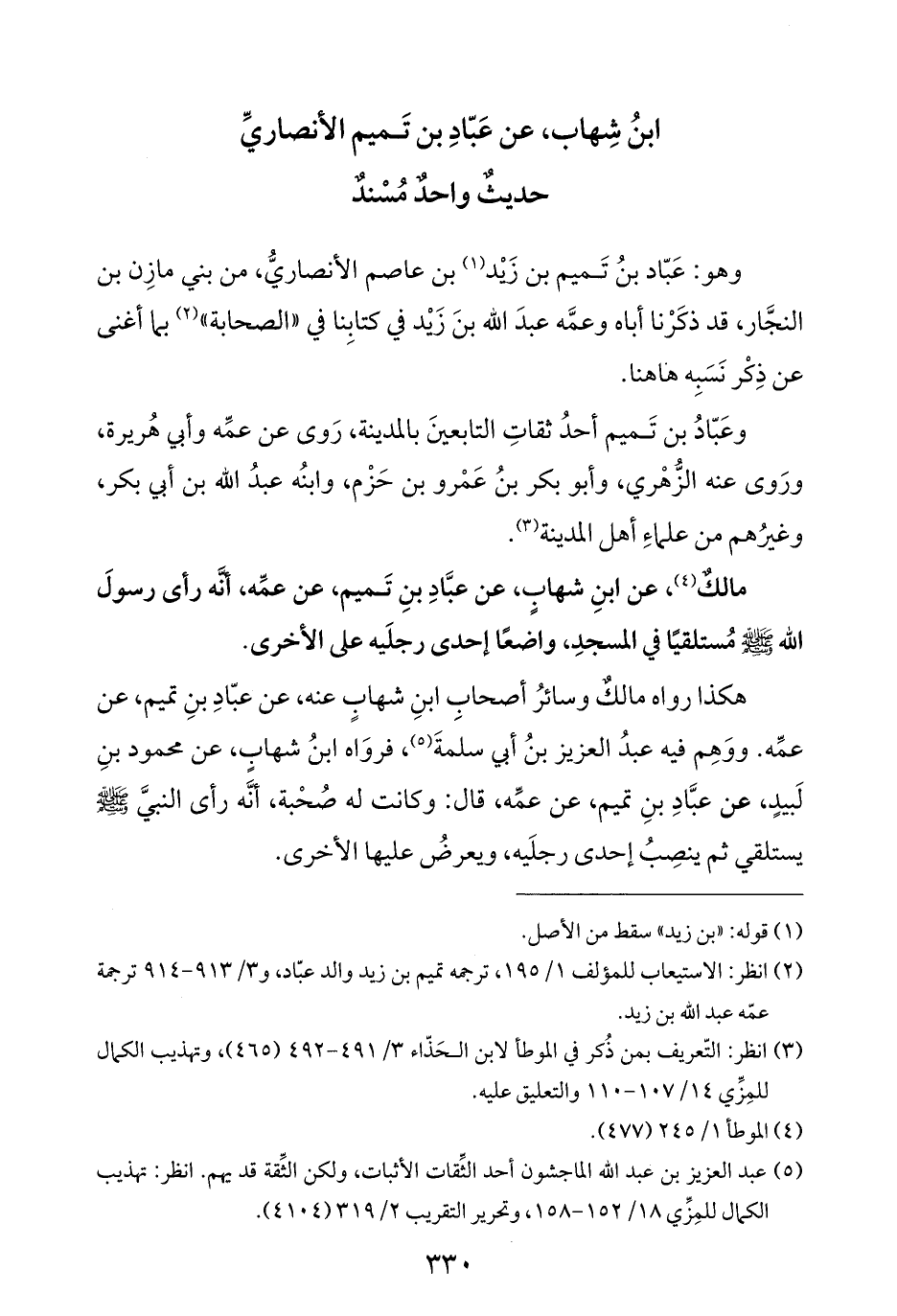 ابنُ شِهاب، عن عَبّادِ بن تَميم الأنصاريِّ حديثٌ واحدٌ مُسْندٌ