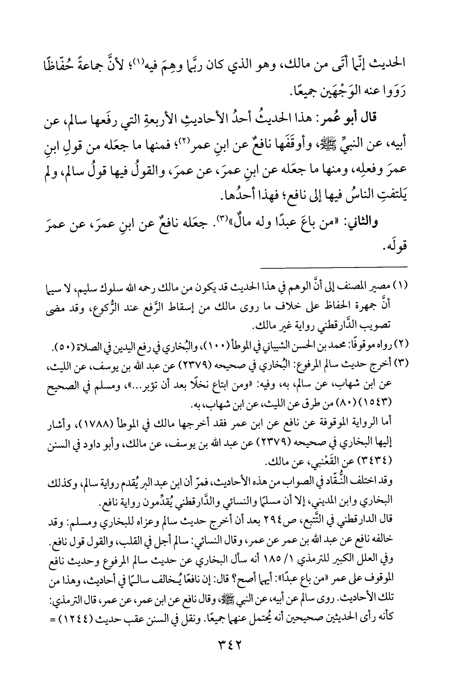 قال أبو عُمر: هذا الحديثُ أحدُ الأحاديثِ الأربعةِ التي رفَعها سالم، عن أبيه، عن النبيِّ - صلى الله عليه وسلم -، وأوقَفَها نافعٌ عن ابنِ عمر (¬٢)؛ فمنها ما جعَله من قولِ ابنِ عمرَ وفعلِه، ومنها ما جعَله عن ابنِ عمرَ، عن عمرَ، والقولُ فيها قولُ سالم، ولم يَلتفتِ الناسُ فيها إلى نافع؛ فهذا أحدُها.