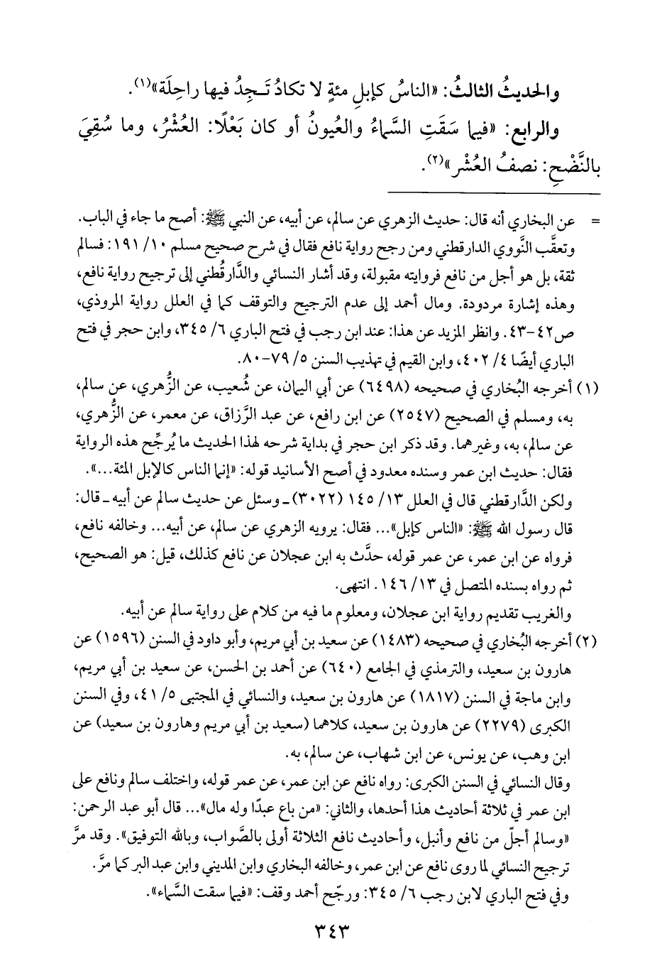 وتعقَّب النَّووي الدارقطني ومن رجح رواية نافع فقال في شرح صحيح مسلم ١٠/ ١٩١: فسالم ثقة، بل هو أجل من نافع فروايته مقبولة، وقد أشار النسائي والدَّارقُطني إلى ترجيح رواية نافع، وهذه إشارة مردودة. ومال أحمد إلى عدم الترجيح والتوقف كما في العلل رواية المروذي، ص ٤٢ - ٤٣. وانظر المزيد عن هذا: عند ابن رجب في فتح الباري ٦/ ٣٤٥، وابن حجر في فتح الباري أيضًا ٤/ ٤٠٢، وابن القيم في تهذيب السنن ٥/ ٧٩ - ٨٠.