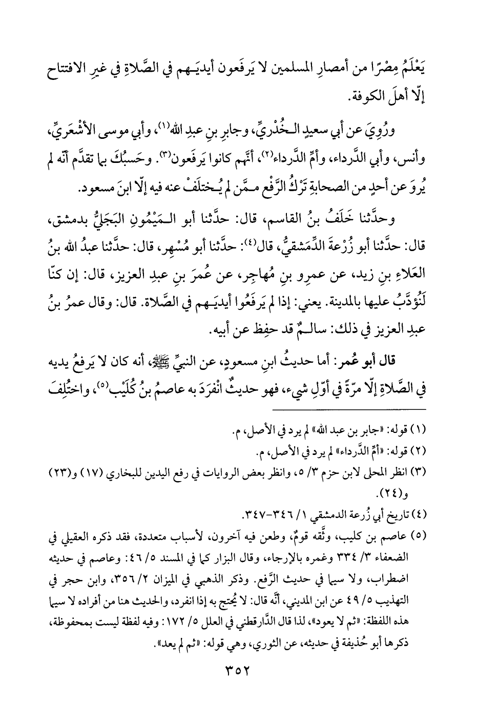 وحدَّثنا خَلَفُ بنُ القاسم، قال: حدَّثنا أبو المَيْمُونِ البَجَليُّ بدمشق، قال: حدَّثنا أبو زُرْعةَ الدِّمَشقيُّ، قال (¬٤): حدَّثنا أبو مُسْهِر، قال: حدَّثنا عبدُ الله بنُ العَلاءِ بنِ زيد، عن عمرِو بنِ مُهاجِر، عن عُمرَ بنِ عبدِ العزيز، قال: إن كنّا لَنُؤدَّبُ عليها بالمدينة. يعني: إذا لم يَرفَعُوا أيديَهم في الصَّلاة. قال: وقال عمرُ بنُ عبدِ العزيز في ذلك: سالمٌ قد حفِظ عن أبيه.