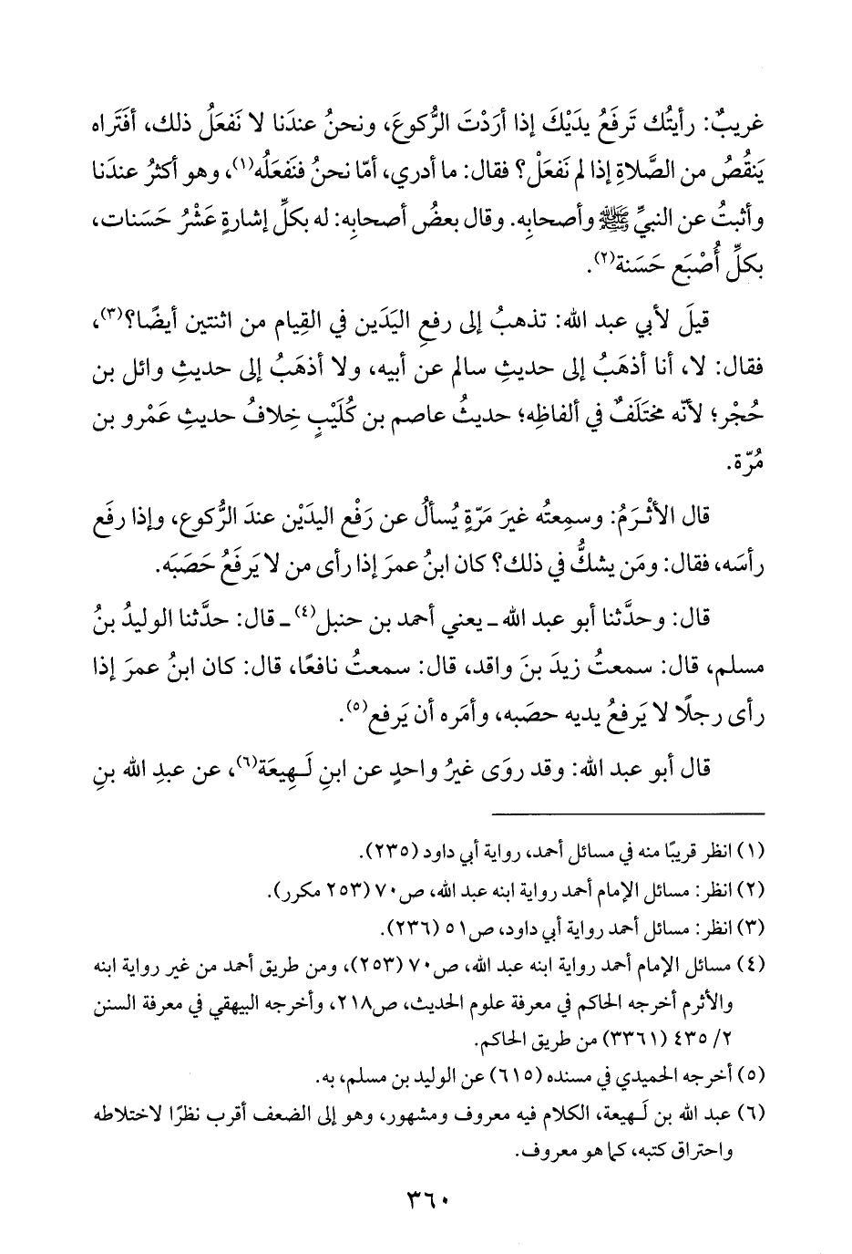 قال الأثْرَمُ: وسمِعتُه غيرَ مَرّةٍ يُسألُ عن رَفْع اليدَيْن عندَ الرُّكوع، وإذا رفَع رأسَه، فقال: ومَن يشكُّ في ذلك؟ كان ابنُ عمرَ إذا رأى من لا يَرفَعُ حَصَبَه.