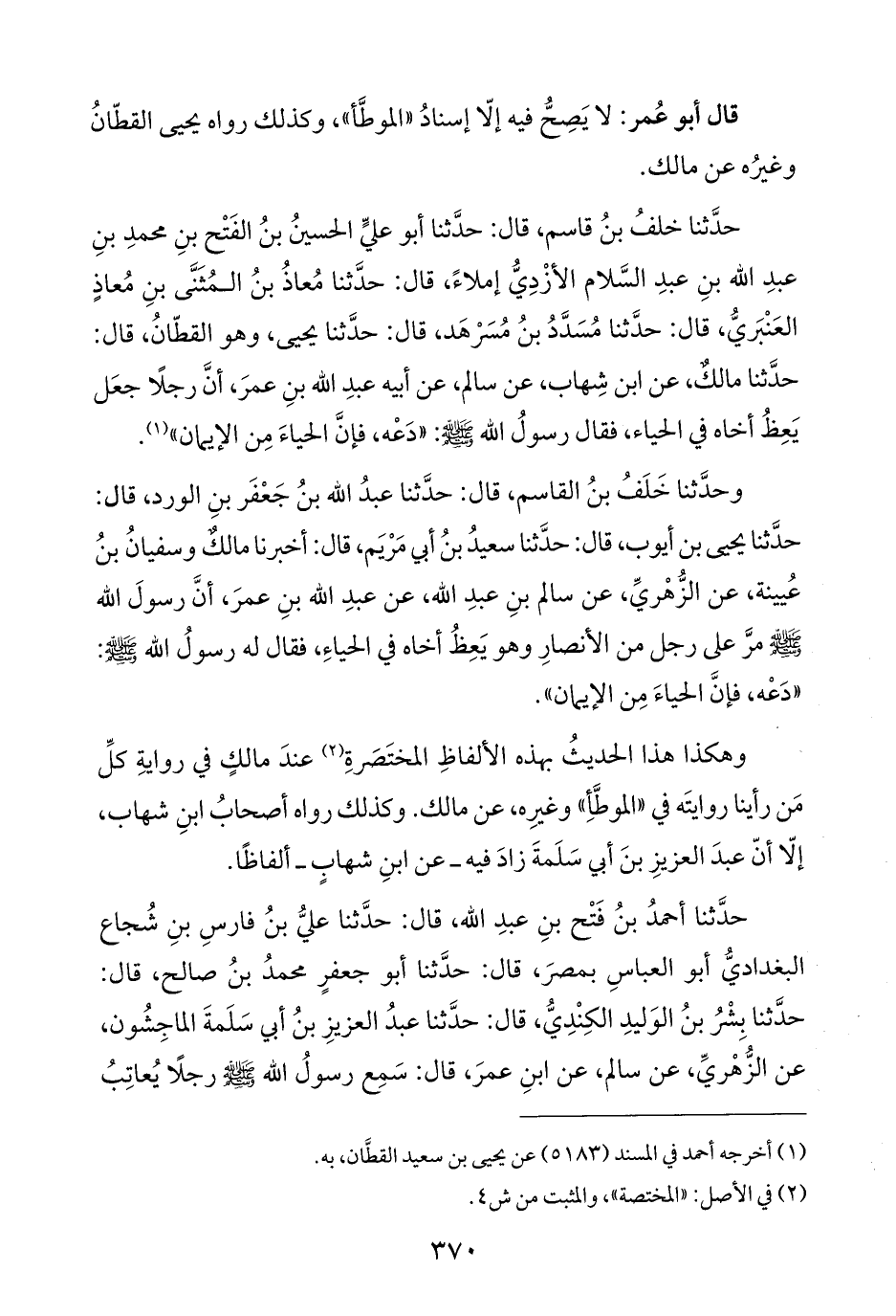 حدَّثنا خلفُ بنُ قاسم، قال: حدَّثنا أبو عليٍّ الحسينُ بنُ الفَتْح بنِ محمدِ بنِ عبدِ الله بنِ عبدِ السَّلام الأزْدِيُّ إملاءً، قال: حدَّثنا مُعاذُ بنُ المُثَنَّى بنِ مُعاذٍ العَنْبَريُّ، قال: حدَّثنا مُسَدَّدُ بنُ مُسَرْهَد، قال: حدَّثنا يحيى، وهو القطّانُ، قال: حدَّثنا مالكٌ، عن ابن شِهاب، عن سالم، عن أبيه عبدِ الله بنِ عمرَ، أنَّ رجلًا جعَل يَعِظُ أخاه في الحياء، فقال رسولُ الله - صلى الله عليه وسلم -: "دَعْه، فإنَّ الحياءَ مِن الإيمان" (¬١).