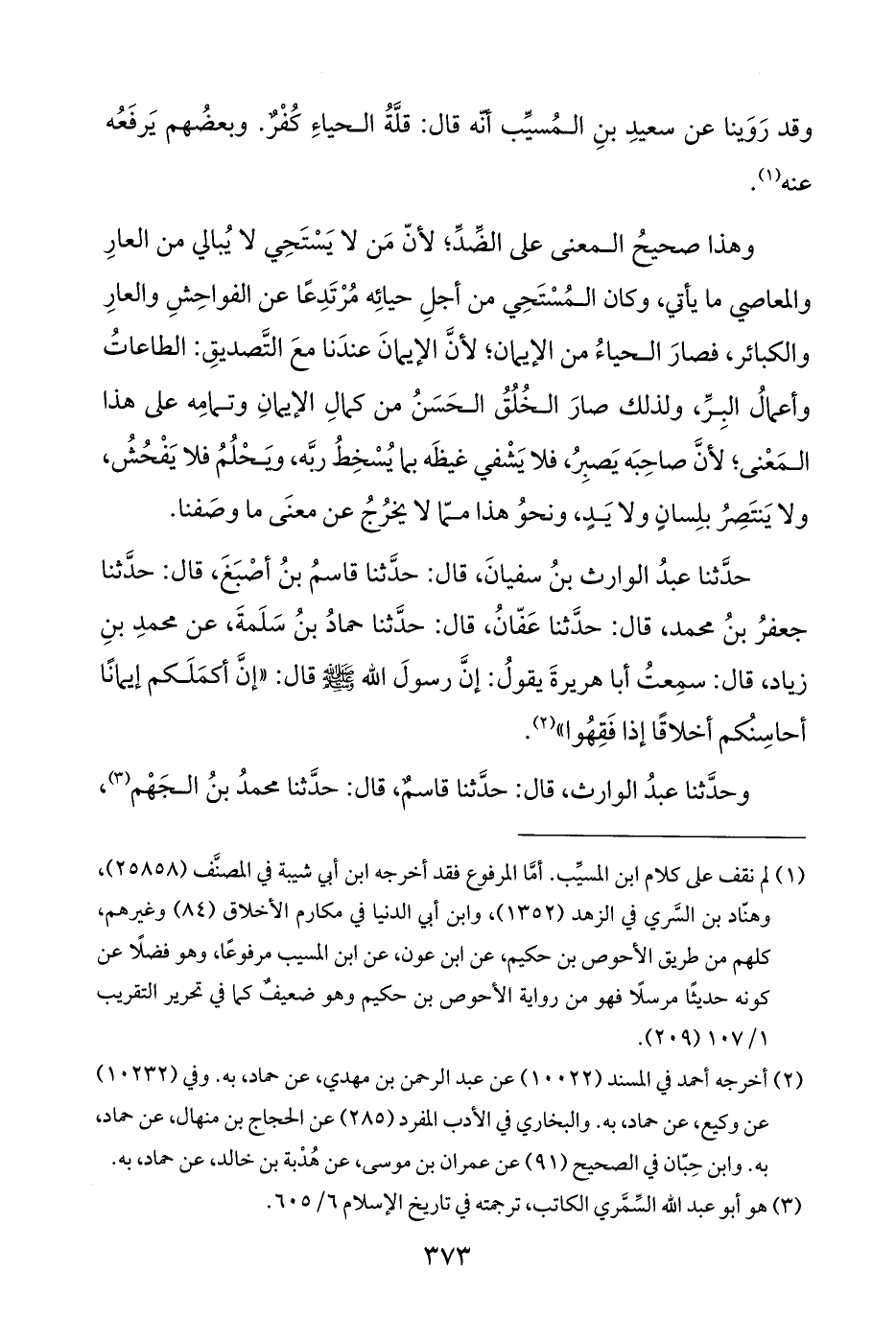 حَدَّثَنَا عبدُ الوارث بنُ سفيانَ، قال: حَدَّثَنَا قاسمُ بنُ أصْبَغَ، قال: حَدَّثَنَا جعفرُ بنُ محمد، قال: حَدَّثَنَا عَفّانُ، قال: حَدَّثَنَا حمادُ بنُ سَلَمةَ، عن محمدِ بنِ زياد، قال: سمِعتُ أبا هريرةَ يقولُ: إنَّ رسولَ الله - صَلَّى اللهُ عَلَيْهِ وَسَلَّمَ - قال: "إنَّ أكمَلَكم إيمانًا أحاسِنكم أخلاقًا إذا فَقِهُوا" (¬٢).