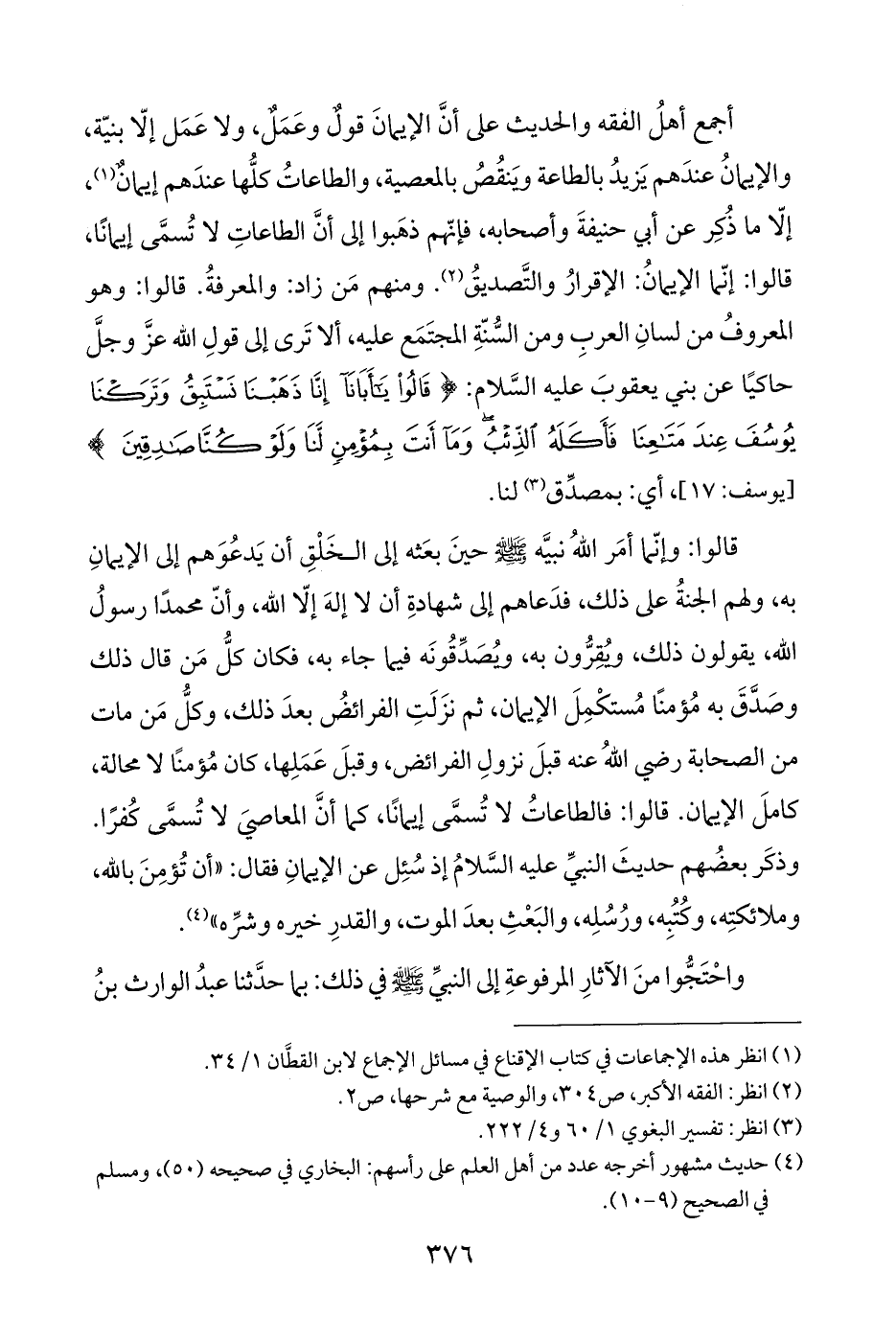 أجمع أهلُ الفقه والحديث على أنَّ الإيمانَ قولٌ وعَمَلٌ، ولا عَمَل إلّا بنيّة، والإيمانُ عندَهم يَزيدُ بالطاعة وَينقُصُ بالمعصية، والطاعاتُ كلُّها عندَهم إيمانٌ (¬١)، إلّا ما ذُكِر عن أبي حنيفةَ وأصحابه، فإنّهم ذهَبوا إلى أنَّ الطاعاتِ لا تُسمَّى إيمانًا، قالوا: إنّما الإيمانُ: الإقرارُ والتَّصديقُ (¬٢). ومنهم مَن زاد: والمعرفةُ. قالوا: وهو المعروفُ من لسانِ العربِ ومن السُّنّةِ المجتَمَع عليه، ألا تَرى إلى قولِ الله عزَّ وجلَّ حاكيًا عن بني يعقوبَ عليه السَّلام: {قَالُوا يَاأَبَانَا إِنَّا ذَهَبْنَا نَسْتَبِقُ وَتَرَكْنَا يُوسُفَ عِنْدَ مَتَاعِنَا فَأَكَلَهُ الذِّئْبُ وَمَا أَنْتَ بِمُؤْمِنٍ لَنَا وَلَوْ كُنَّا صَادِقِينَ} [يوسف: ١٧] أي: بمصدِّق (¬٣) لا.