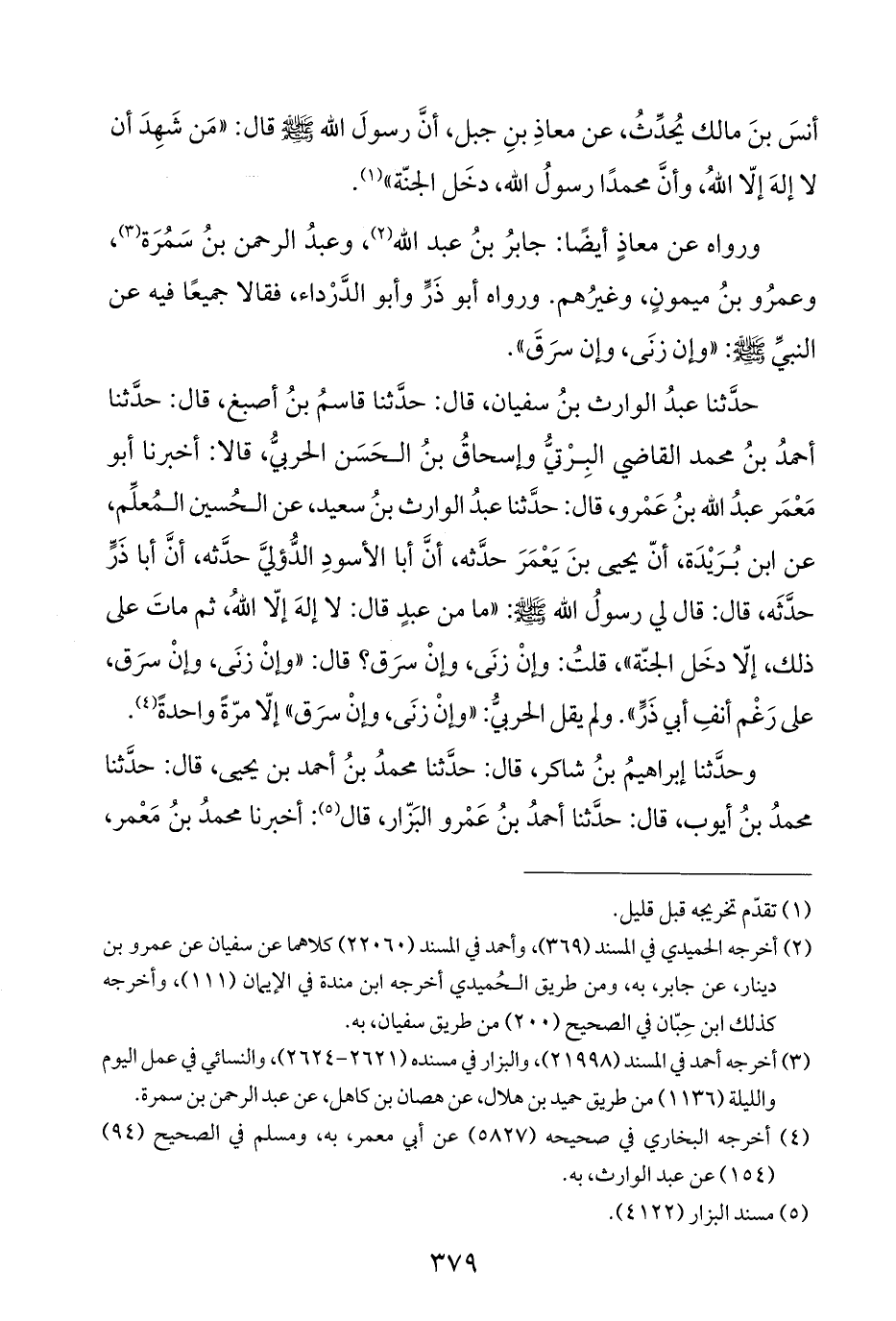 حَدَّثَنَا عبدُ الوارث بنُ سفيان، قال: حَدَّثَنَا قاسمُ بنُ أصبغ، قال: حَدَّثَنَا أحمدُ بنُ محمد القاضي البِرْتيُّ وإسحاقُ بنُ الحَسَن الحربيُّ، قالا: أخبرنا أبو مَعْمَر عبدُ الله بنُ عَمْرو، قال: حَدَّثَنَا عبدُ الوارث بنُ سعيد، عن الحُسين المُعلِّم، عن ابن بُرَيْدَة، أنّ يحيى بنَ يَعْمَرَ حدَّثه، أنَّ أبا الأسودِ الدُّؤليَّ حدَّثه، أنَّ أبا ذَرٍّ حدَّثَه، قال: قال لي رسولُ الله - صَلَّى اللهُ عَلَيْهِ وَسَلَّمَ -: "ما من عبدٍ قال: لا إلهَ إلّا اللهُ، ثم ماتَ على ذلك، إلّا دخَل الجنّة"، قلتُ: وإنْ زنَى، وإنْ سرَق؛ قال: "وإنْ زنَى، وإنْ سَرَق، على رَغْم أنفِ أبي ذَرٍّ". ولم يقل الحربيُّ: "وإنْ زنَى، وإنْ سرَق" إلّا مرّةً واحدةً (¬٤).