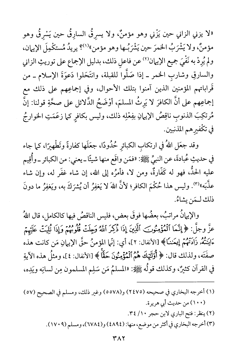 "لا يزني الزاني حين يَزْني وهو مؤمنٌ، ولا يسرِقُ السارِقُ حين يَسْرِقُ وهو مؤمنٌ، ولا يَشْرَبُ الخمرَ حين يَشْرَبُها وهو مؤمن" (¬١)؛ يريدُ مُستكْمِلَ الإيمان، ولم يُرِدْ به نَفْيَ جميع الإيمان (¬٢) عن فاعلِ ذلك، بدليل الإجماع على توريثِ الزاني والسارقِ وشاربِ الخمر - إذا صَلَّوا للقبلة، وانتَحَلوا دَعوَةَ الإسلام - من قَراباتهم المؤمنين الذين أَمنوا بتلك - الأحوال، وفي إجماعِهم على ذلك مع إجماعِهم على أنَّ الكافرَ لا يَرِثُ المسلمَ، أوْضَحُ الدَّلائل على صحَّةِ قولنا: إنَّ مُرتكِبَ الذنوبِ ناقِصُ الإيمانِ بفِعْلِه ذلك، وليس بكافرٍ كما زعَمَتِ الخوارجُ في تكْفيرِهم المذنبين.