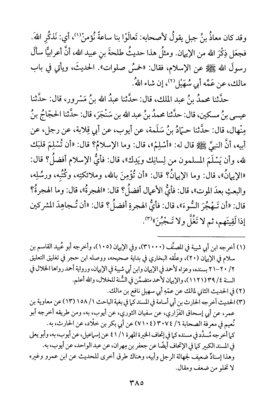 حَدَّثَنَا محمدُ بنُ عبد الملك، قال: حَدَّثَنَا عبدُ الله بنُ مَسْرور، قال: حَدَّثَنَا عيسى بنُ مسكين، قال: حَدَّثَنَا محمدُ بنُ عبد الله بن سَنْجَرَ، قال: حَدَّثَنَا الحجّاجُ بنُ مِنْهال، قال: حَدَّثَنَا حمّادُ بنُ سَلَمة، عن أيوب، عن أبي قِلابة، عن رجل، عن أبيه، أنَّ النبيَّ - صَلَّى اللهُ عَلَيْهِ وَسَلَّمَ - قال له: "أسْلِمْ"، قال: وما الإسلامُ؟ قال: "أن تُسْلِمَ قلبَك للّه، وأن يَسْلَمَ المسلمون من لِسانِك ويَدِك"، قال: فأيُّ الإسلام أفضلُ؟ قال: "الإيمانُ"، قال: وما الإيمانُ؟ قال: "أن تُؤْمِنَ باللّه، وملائكتِه، وكُتُبِه، ورسُلِه، والبعثِ بعدَ الموت"، قال: فأيُّ الأعمال أفضلُ؟ قال: "الهجرةُ"، قال: وما الهجرةُ؟ قال: "أن تَهْجُرَ السُّوءَ"، قال: فأيُّ الهجرةِ أفضلُ؟ قال: "أن تُجاهِدَ المشركين إذا لَقِيتَهم، ثم لا تَغُلَّ ولا تَجْبُنَ" (¬٣).