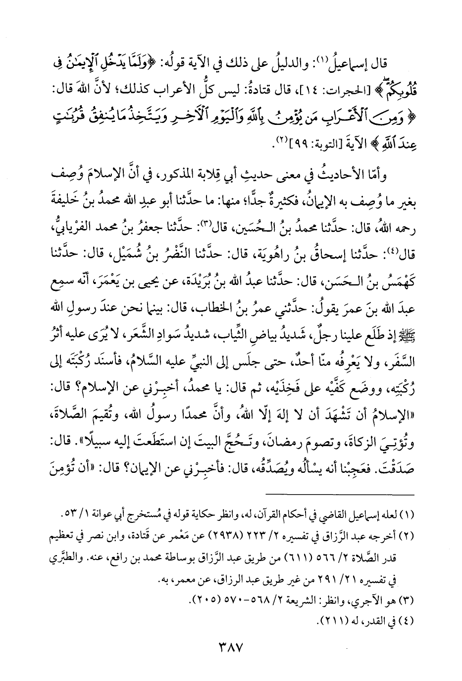 وأمّا الأحاديثُ في معنى حديثِ أبي قِلابة المذكور، في أنَّ الإسلامَ وُصِف بغير ما وُصِف به الإيمانُ، فكثيرةٌ جدًّا؛ منها: ما حَدَّثَنَا أبو عبدِ الله محمدُ بنُ خَليفةَ رحمه اللهُ، قال: حَدَّثَنَا محمدُ بنُ الحُسَين، قال (¬٣): حَدَّثَنَا جعفرُ بنُ محمد الفرْيابيُّ، قال (¬٤): حَدَّثَنَا إسحاقُ بنُ راهُويَة، قال: حَدَّثَنَا النَّضْرُ بنُ شُمَيْل، قال: حَدَّثَنَا كَهْمَسُ بنُ الحَسَن، قال: حَدَّثَنَا عبدُ الله بنُ بُرَيْدَة، عن يحيى بن يَعْمَرَ، أنَّه سمِع عبدَ الله بنَ عمرَ يقولُ: حدَّثني عمرُ بنُ الخطاب، قال: بينما نحن عندَ رسولِ الله - صَلَّى اللهُ عَلَيْهِ وَسَلَّمَ - إذ طَلَع علينا رجل، شَديدُ بياضِ الثِّياب، شديدُ سَوادِ الشَّعَر، لا يُرَى عليه أثرُ السَّفَر، ولا يَعْرِفُه منَّا أحدٌ، حتى جلَس إلى النبيِّ عليه السَّلامُ، فأسنَد رُكْبَتَه إلى رُكْبَتِه، ووضَع كَفَّيْه على فَخِذَيْه، ثم قال: يا محمدُ، أخبِرْني عن الإسلام؟ قال: "الإسلامُ أن تَشْهَدَ أن لا إلهَ إلّا اللهُ، وأنَّ محمدًا رسولُ الله، وتُقيمَ الصَّلاةَ، وتُؤتِيَ الزكاةَ، وتصومَ رمضانَ، وتَحُجَّ البيتَ إن استَطَعتَ إليه سبيلًا". قال: صَدَقْتَ. فعَجِبْنا أنه يسْألُه وُيصَدِّقُه، قال: فأخبِرْني عن الإيمان؟ قال: "أن تُؤمِنَ